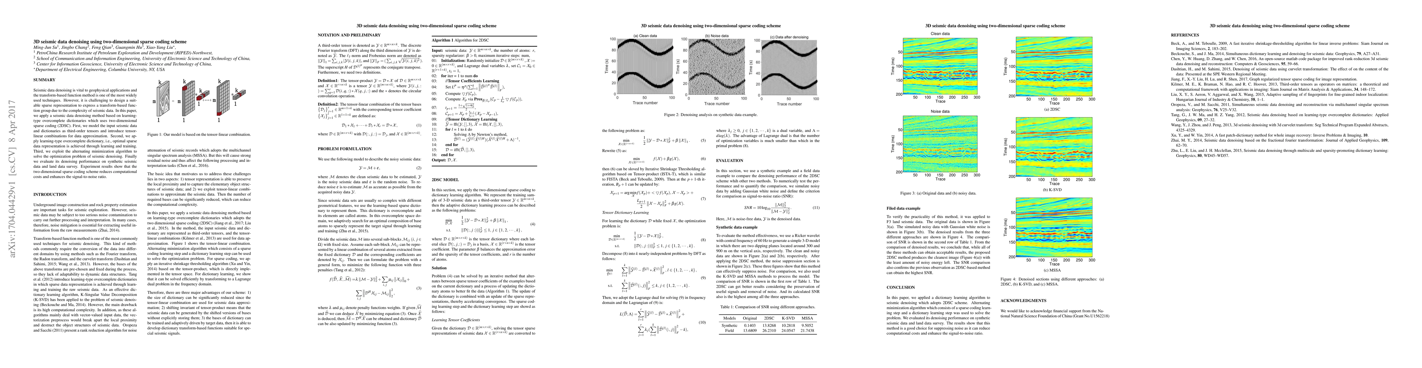 Seismic data denoising is vital to geophysical applications and the transform-based function method is one of the most widely used techniques. However, it is challenging to design a suit- able sparse representation to express a transform-based func- tion group due to the complexity of seismic data. In this paper, we apply a seismic data denoising method based on learning- type overcomplete dictionaries which uses two-dimensional sparse coding (2DSC). First, we model the input seismic data and dictionaries as third-order tensors and introduce tensor- linear combinations for data approximation. Second, we ap- ply learning-type overcomplete dictionary, i.e., optimal sparse data representation is achieved through learning and training. Third, we exploit the alternating minimization algorithm to solve the optimization problem of seismic denoising. Finally we evaluate its denoising performance on synthetic seismic data and land data survey. Experiment results show that the two-dimensional sparse coding scheme reduces computational costs and enhances the signal-to-noise ratio.