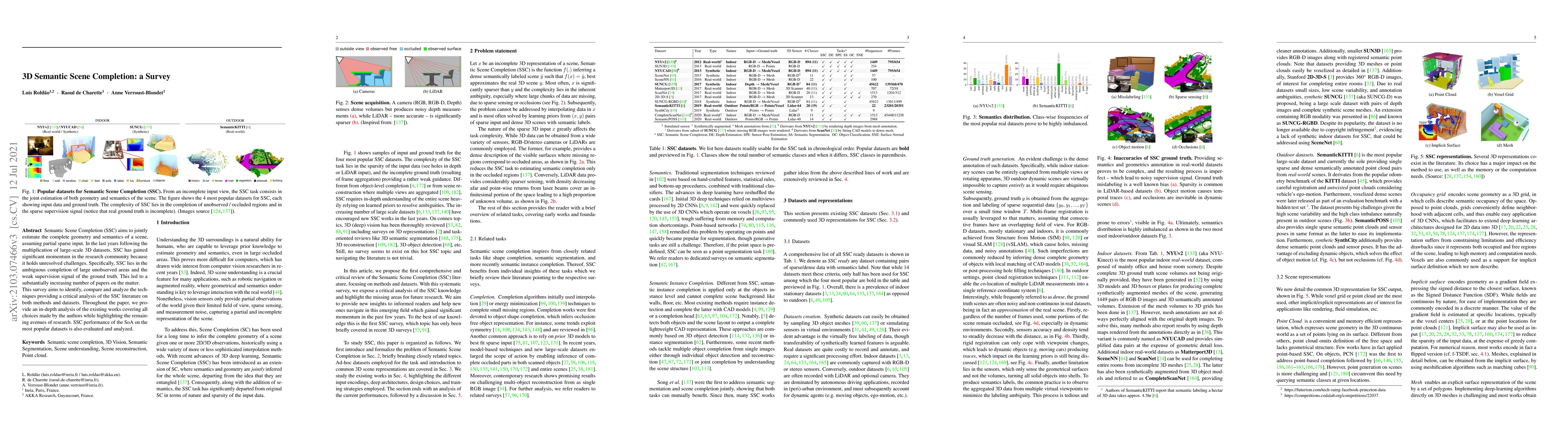 Semantic Scene Completion (SSC) aims to jointly estimate the complete geometry and semantics of a scene, assuming partial sparse input. In the last years following the multiplication of large-scale 3D datasets, SSC has gained significant momentum in the research community because it holds unresolved challenges. Specifically, SSC lies in the ambiguous completion of large unobserved areas and the weak supervision signal of the ground truth. This led to a substantially increasing number of papers on the matter. This survey aims to identify, compare and analyze the techniques providing a critical analysis of the SSC literature on both methods and datasets. Throughout the paper, we provide an in-depth analysis of the existing works covering all choices made by the authors while highlighting the remaining avenues of research. SSC performance of the SoA on the most popular datasets is also evaluated and analyzed.