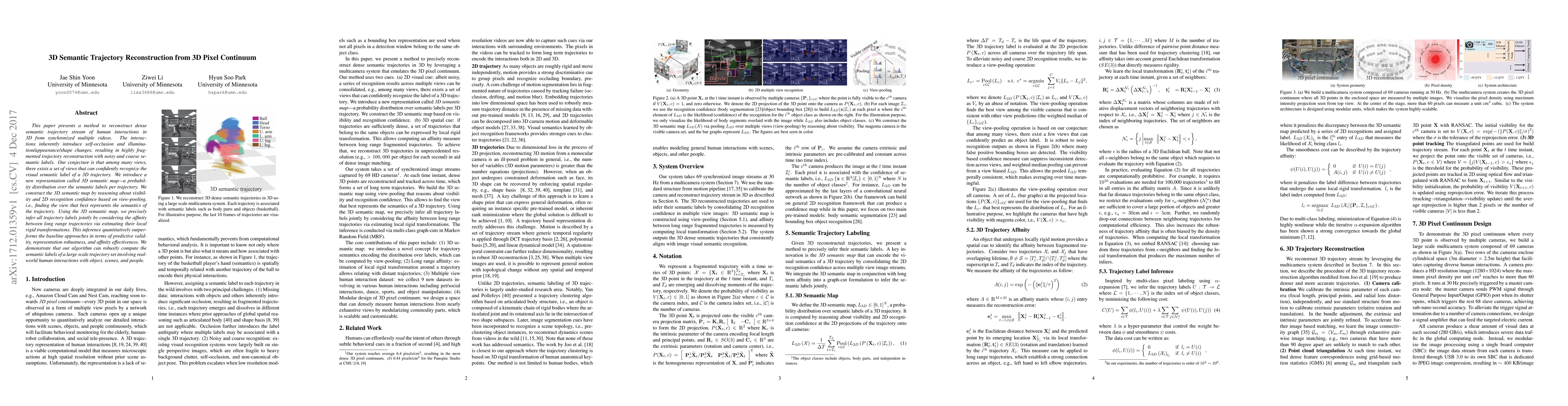 This paper presents a method to reconstruct dense semantic trajectory stream of human interactions in 3D from synchronized multiple videos. The interactions inherently introduce self-occlusion and illumination/appearance/shape changes, resulting in highly fragmented trajectory reconstruction with noisy and coarse semantic labels. Our conjecture is that among many views, there exists a set of views that can confidently recognize the visual semantic label of a 3D trajectory. We introduce a new representation called 3D semantic map---a probability distribution over the semantic labels per trajectory. We construct the 3D semantic map by reasoning about visibility and 2D recognition confidence based on view-pooling, i.e., finding the view that best represents the semantics of the trajectory. Using the 3D semantic map, we precisely infer all trajectory labels jointly by considering the affinity between long range trajectories via estimating their local rigid transformations. This inference quantitatively outperforms the baseline approaches in terms of predictive validity, representation robustness, and affinity effectiveness. We demonstrate that our algorithm can robustly compute the semantic labels of a large scale trajectory set involving real-world human interactions with object, scenes, and people.