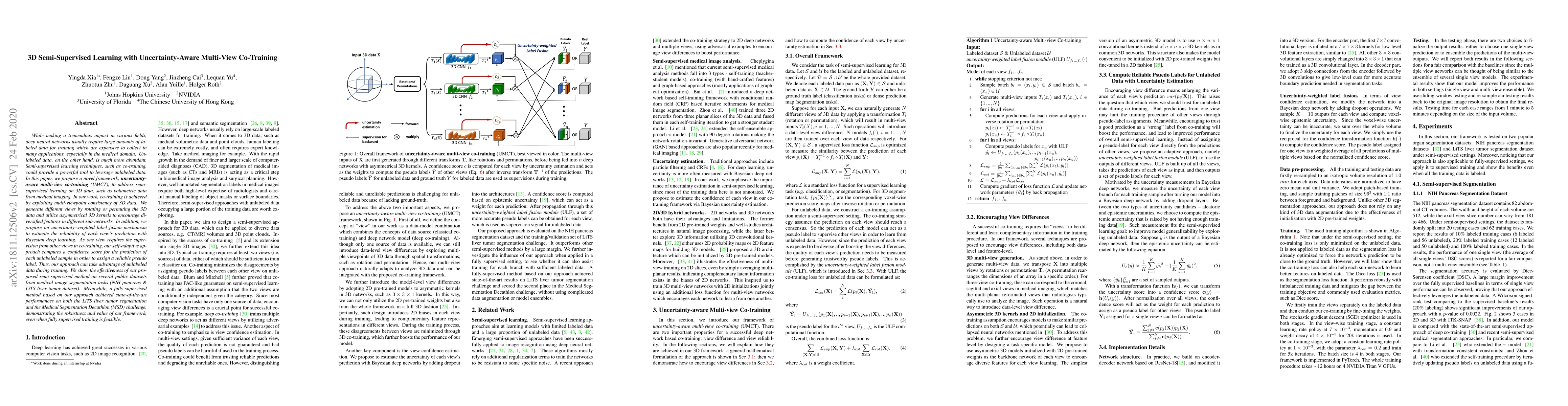 This paper introduces a novel semi-supervised learning framework called uncertainty-aware multi-view co-training (UMCT) for 3D data, particularly medical imaging. The method leverages unlabeled data by generating multi-viewpoint consistency and employing an uncertainty-weighted label fusion mechanism, achieving state-of-the-art results in medical image segmentation tasks.