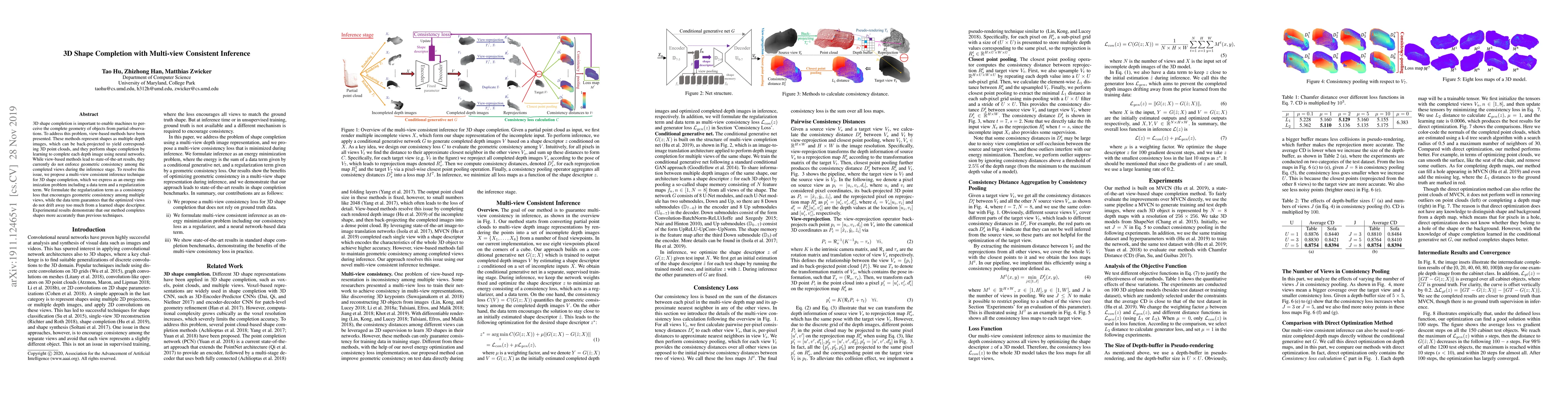 This paper proposes a multi-view consistent inference technique for 3D shape completion, addressing the lack of geometric consistency in previous view-based methods. It formulates the problem as an energy minimization task with a consistency loss to ensure view coherence, achieving more accurate shape completions.