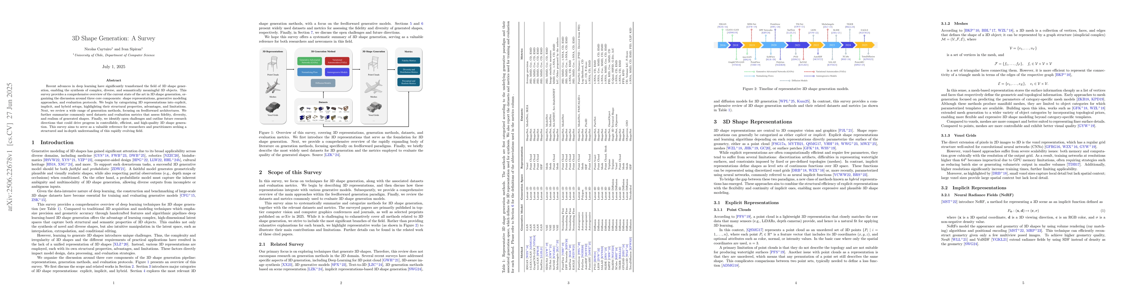 Recent advances in deep learning have significantly transformed the field of 3D shape generation, enabling the synthesis of complex, diverse, and semantically meaningful 3D objects. This survey provides a comprehensive overview of the current state of the art in 3D shape generation, organizing the discussion around three core components: shape representations, generative modeling approaches, and evaluation protocols. We begin by categorizing 3D representations into explicit, implicit, and hybrid setups, highlighting their structural properties, advantages, and limitations. Next, we review a wide range of generation methods, focusing on feedforward architectures. We further summarize commonly used datasets and evaluation metrics that assess fidelity, diversity, and realism of generated shapes. Finally, we identify open challenges and outline future research directions that could drive progress in controllable, efficient, and high-quality 3D shape generation. This survey aims to serve as a valuable reference for researchers and practitioners seeking a structured and in-depth understanding of this rapidly evolving field.
