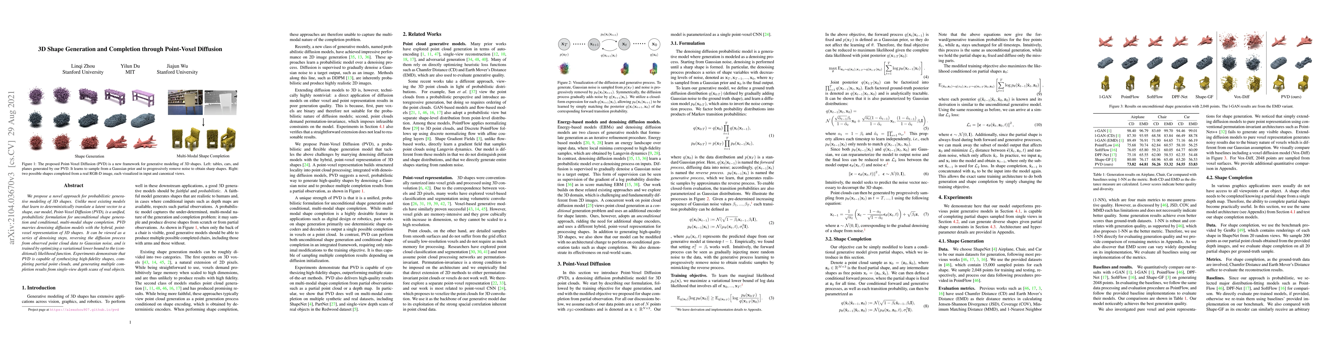 The paper introduces Point-Voxel Diffusion (PVD), a probabilistic generative model combining denoising diffusion and point-voxel representations for 3D shape generation and completion. PVD synthesizes high-fidelity shapes and completes partial point clouds, demonstrating its effectiveness through experiments on real-object scans.