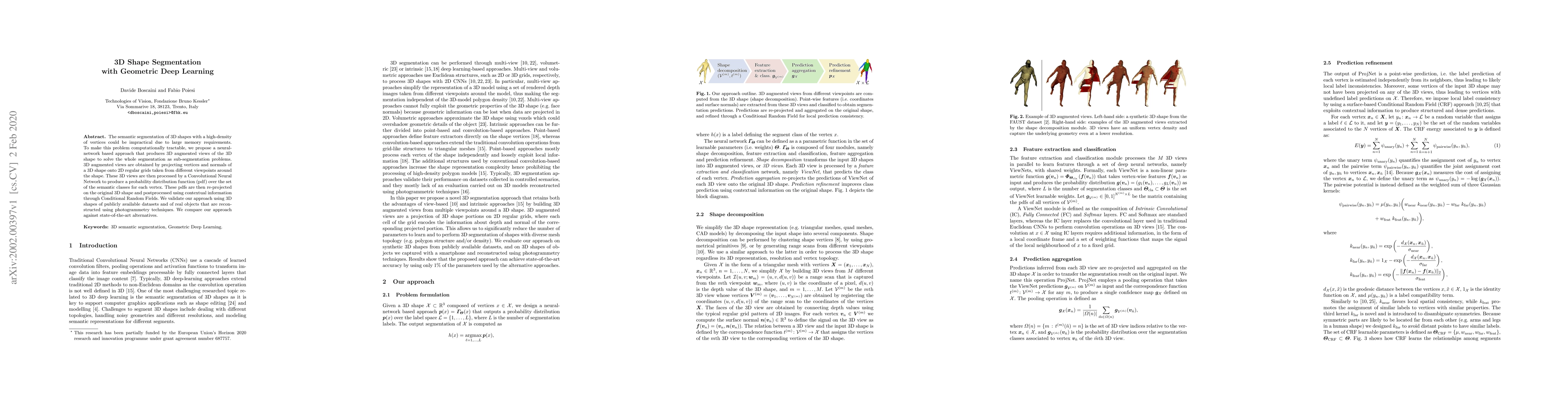 This paper proposes a neural-network based method for segmenting 3D shapes by generating 3D augmented views from different viewpoints, processed by a Convolutional Neural Network to produce semantic class probability distributions, which are then refined using Conditional Random Fields. The approach is validated against state-of-the-art methods on both public datasets and photogrammetry-reconstructed objects.