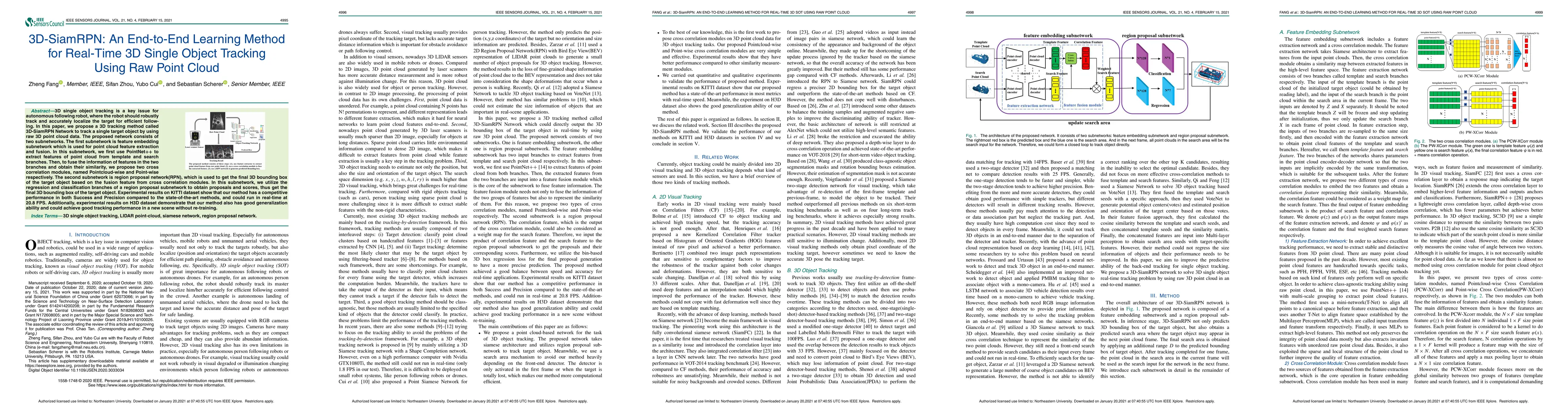 The paper proposes a 3D-SiamRPN Network for real-time 3D single object tracking using raw point cloud data. It employs PointNet++ for feature extraction and fusion, followed by a region proposal network to obtain the target's 3D bounding box, achieving competitive performance on KITTI and H3D datasets.