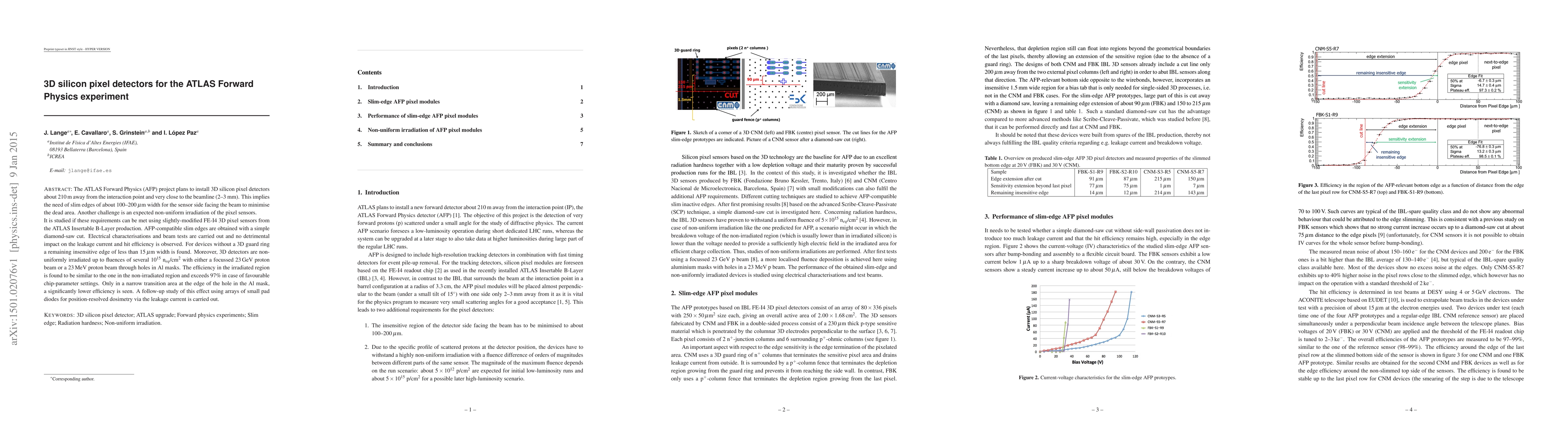 The ATLAS Forward Physics project employs 3D silicon pixel detectors with slim edges to minimize dead areas, utilizing modified FE-I4 sensors. Tests show no adverse effects on performance despite non-uniform irradiation up to 10$^{15}$ n$_{eq}$/cm$^2$, maintaining efficiency over 97% in most regions.