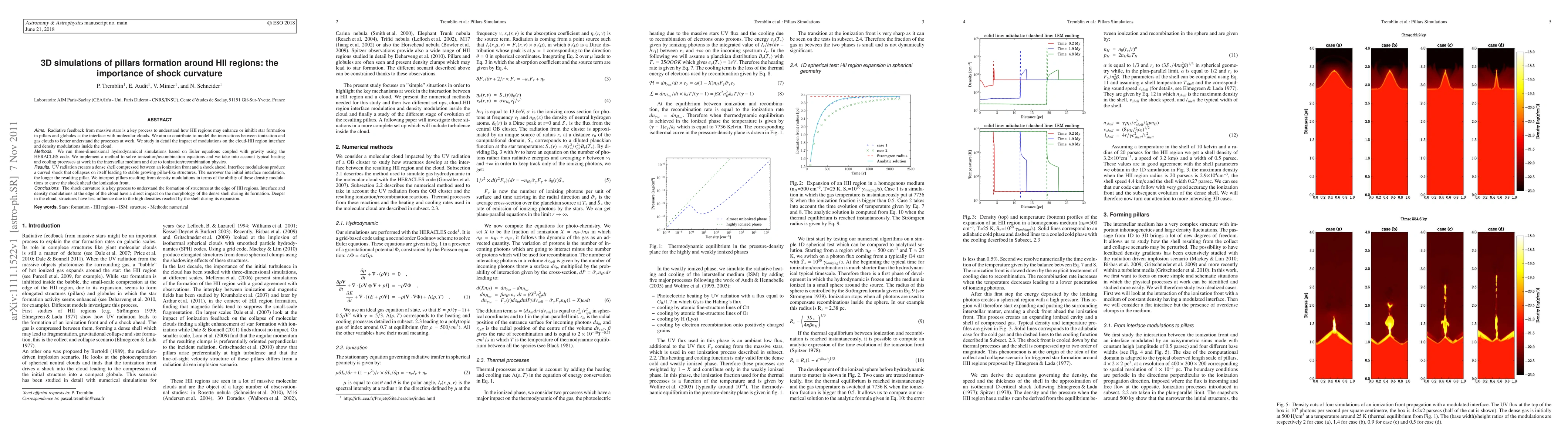 Researchers used 3D simulations to study how shock curvature affects pillar formation around HII regions, finding that narrower interface modulations create longer pillars.