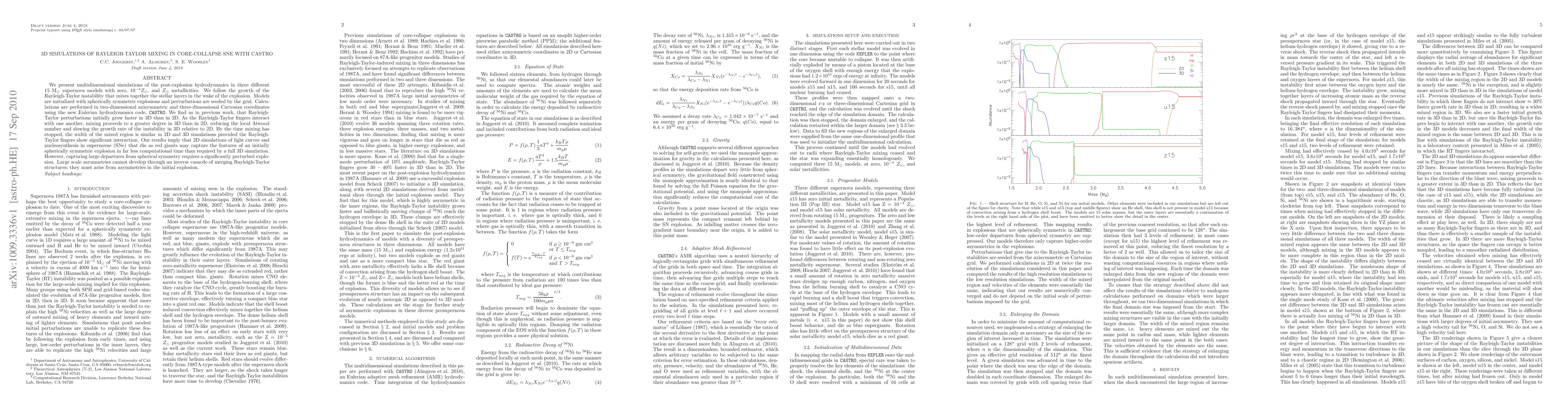 This paper uses CASTRO to simulate multidimensional hydrodynamics in core-collapse supernovae, showing that Rayleigh-Taylor instability grows faster in 3D than 2D initially. However, 3D simulations achieve greater mixing due to finger interactions, ultimately leading to similar mixed region widths in 2D and 3D when significant interactions occur.