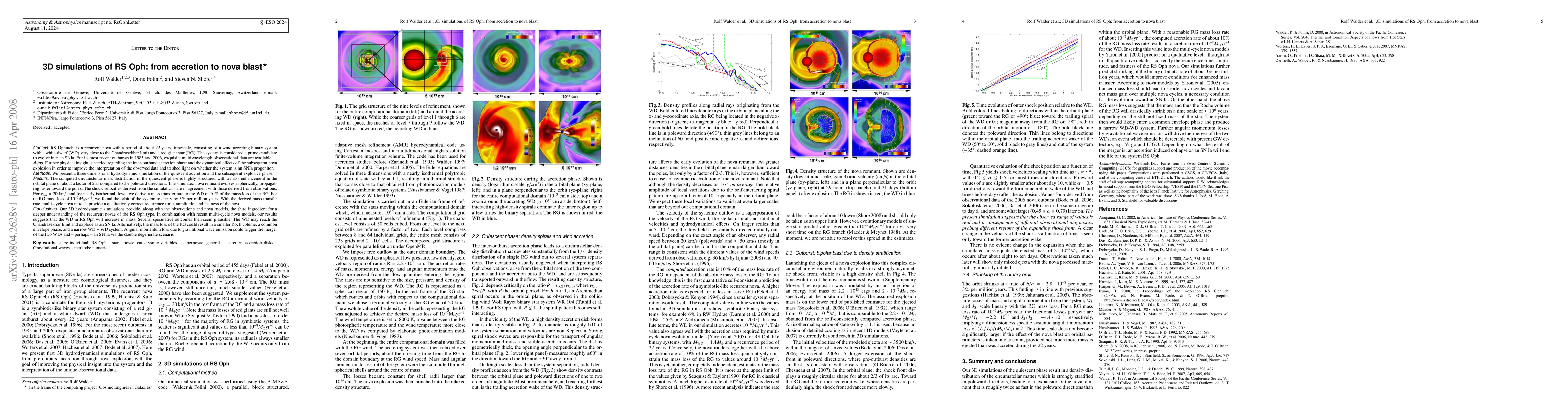 RS Ophiuchi is a recurrent nova with a period of about 22 years, consisting of a wind accreting binary system with a white dwarf (WD) very close to the Chandrasekhar limit and a red giant star (RG). The system is considered a prime candidate to evolve into an SNIa. We present a 3D hydrodynamic simulation of the quiescent accretion and the subsequent explosive phase. The computed circumstellar mass distribution in the quiescent phase is highly structured with a mass enhancement in the orbital plane of about a factor of 2 as compared to the poleward directions. The simulated nova remnant evolves aspherically, propagating faster toward the poles. The shock velocities derived from the simulations are in agreement with those derived from observations. For v_RG = 20 km/s and for nearly isothermal flows, we derive a mass transfer rate to the WD of 10% of the mass loss of the RG. For an RG mass loss of 10^{-7} solar masses per year, we found the orbit of the system to decay by 3% per million years. With the derived mass transfer rate, multi-cycle nova models provide a qualitatively correct recurrence time, amplitude, and fastness of the nova. Our simulations provide, along with the observations and nova models, the third ingredient for a deeper understanding of the recurrent novae of the RS Oph type. In combination with recent multi-cycle nova models, our results suggests that the WD in RS Oph will increase in mass. Several speculative outcomes then seem plausible. The WD may reach the Chandrasekhar limit and explode as an SN Ia. Alternatively, the mass loss of the RG could result in a smaller Roche volume, a common envelope phase, and a narrow WD+WD system. Angular momentum loss due to graviational wave emission could trigger the merger of the two WDs and - perhaps - an SN Ia via the double degenerate scenario.