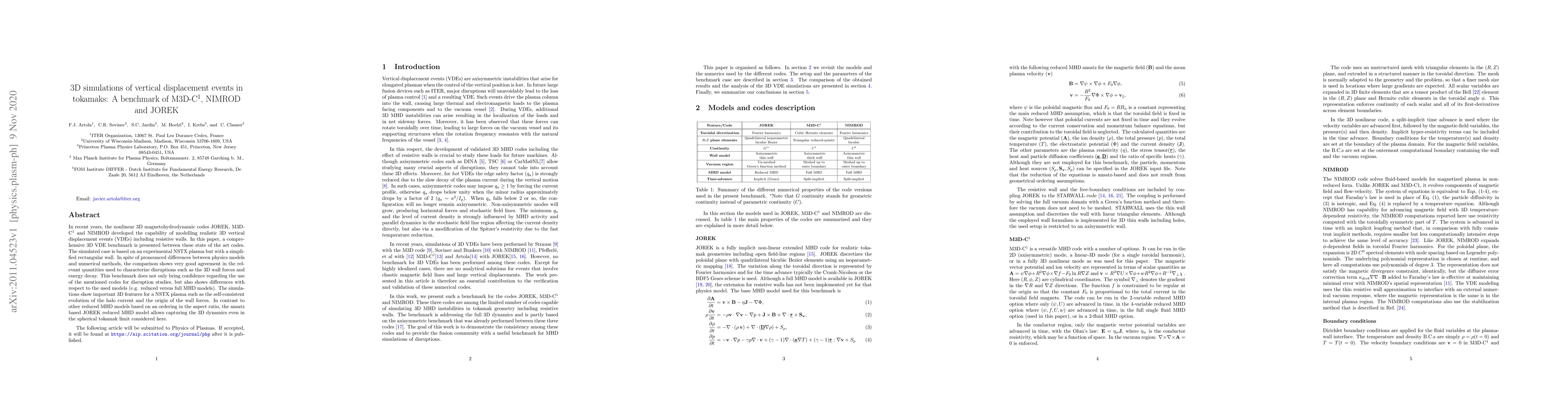 This paper presents a benchmark comparing 3D simulations of vertical displacement events (VDEs) in tokamaks using the M3D-C$^1$, NIMROD, and JOREK codes, showing good agreement in key disruption metrics despite differences in physics and numerical methods. The study highlights the importance of 3D features and the effectiveness of JOREK's reduced MHD model in capturing these dynamics.