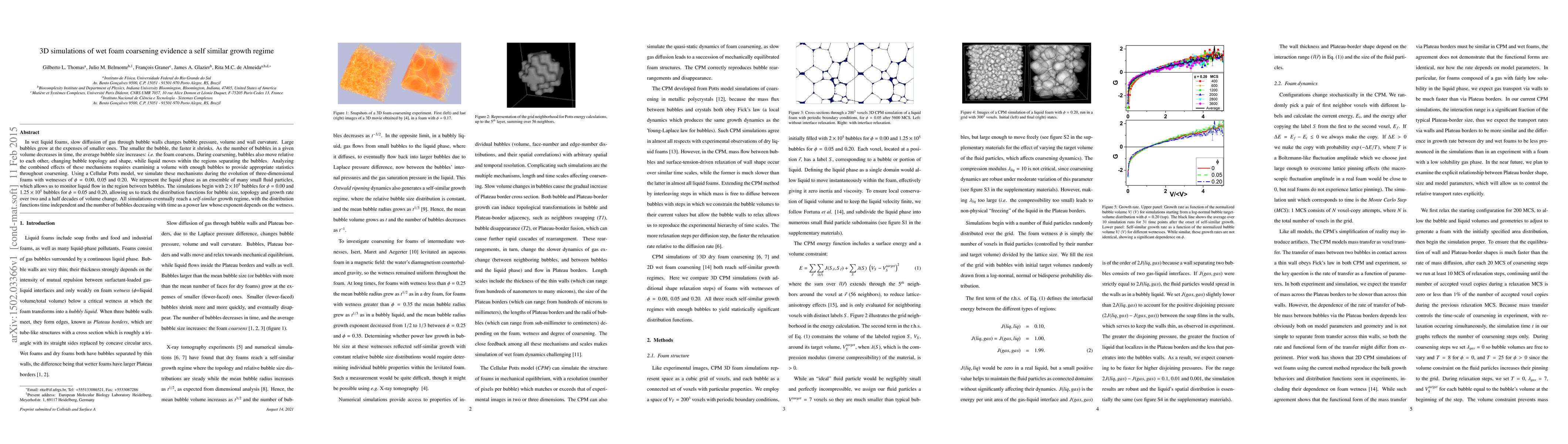 In wet liquid foams, slow diffusion of gas through bubble walls changes bubble pressure, volume and wall curvature. Large bubbles grow at the expenses of smaller ones. The smaller the bubble, the faster it shrinks. As the number of bubbles in a given volume decreases in time, the average bubble size increases: i.e. the foam coarsens. During coarsening, bubbles also move relative to each other, changing bubble topology and shape, while liquid moves within the regions separating the bubbles. Analyzing the combined effects of these mechanisms requires examining a volume with enough bubbles to provide appropriate statistics throughout coarsening. Using a Cellular Potts model, we simulate these mechanisms during the evolution of three-dimensional foams with wetnesses of $\phi=0.00$, $0.05$ and $ 0.20$. We represent the liquid phase as an ensemble of many small fluid particles, which allows us to monitor liquid flow in the region between bubbles. The simulations begin with $2 \times 10^5$ bubbles for $\phi = 0.00$ and $1.25 \times 10^5$ bubbles for $\phi = 0.05$ and $0.20$, allowing us to track the distribution functions for bubble size, topology and growth rate over two and a half decades of volume change. All simulations eventually reach a self-similar growth regime, with the distribution functions time independent and the number of bubbles decreasing with time as a power law whose exponent depends on the wetness.