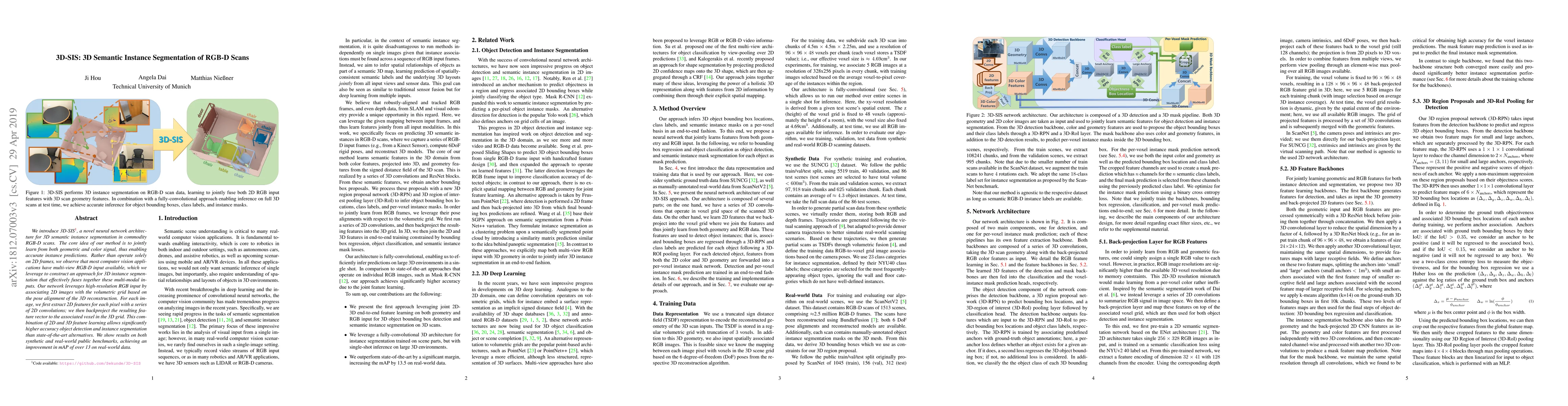 The paper introduces 3D-SIS, a neural network for 3D semantic instance segmentation using RGB-D scans, combining geometric and color information for accurate predictions. The method leverages multi-view RGB-D data and backprojects 2D features to a 3D grid, achieving superior performance over existing methods.