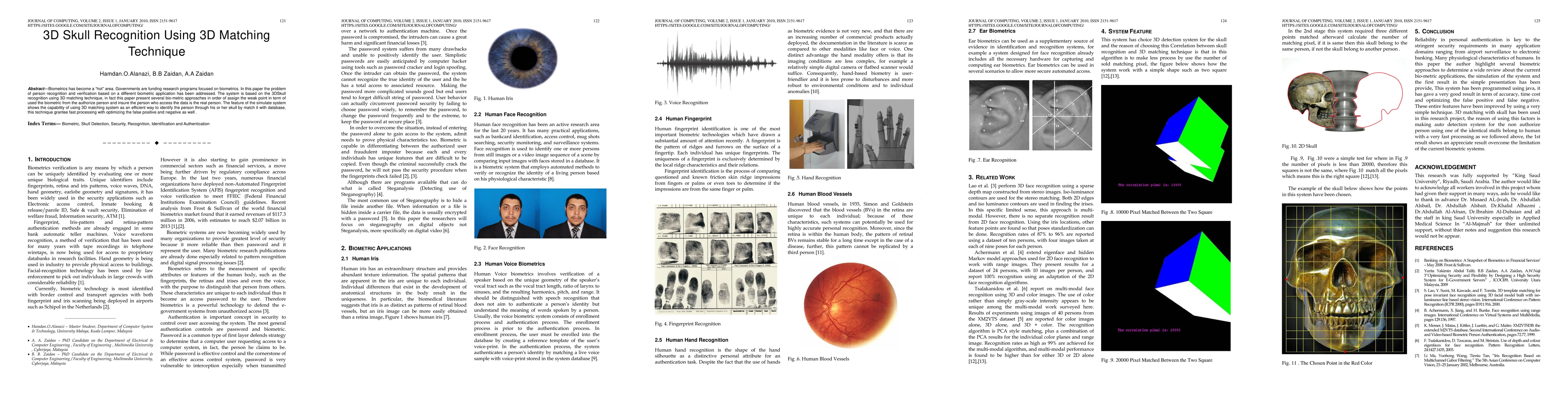 Biometrics has become a "hot" area. Governments are funding research programs focused on biometrics. In this paper the problem of person recognition and verification based on a different biometric application has been addressed. The system is based on the 3DSkull recognition using 3D matching technique, in fact this paper present several bio-metric approaches in order of assign the weak point in term of used the biometric from the authorize person and insure the person who access the data is the real person. The feature of the simulate system shows the capability of using 3D matching system as an efficient way to identify the person through his or her skull by match it with database, this technique grantee fast processing with optimizing the false positive and negative as well .