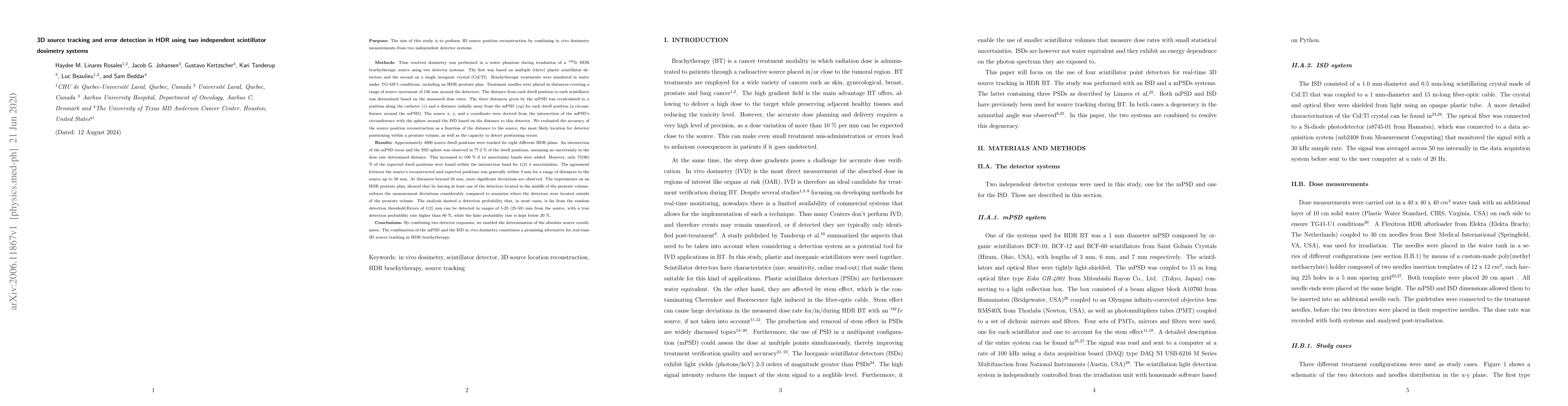 This study combines in vivo dosimetry from two independent scintillator systems—three plastic scintillators and one CsI:Tl crystal—to reconstruct 3D source positions in high dose rate brachytherapy, enhancing error detection and dose verification. The method allows for absolute source coordinate determination and can be extended to integrate various dosimetry systems.