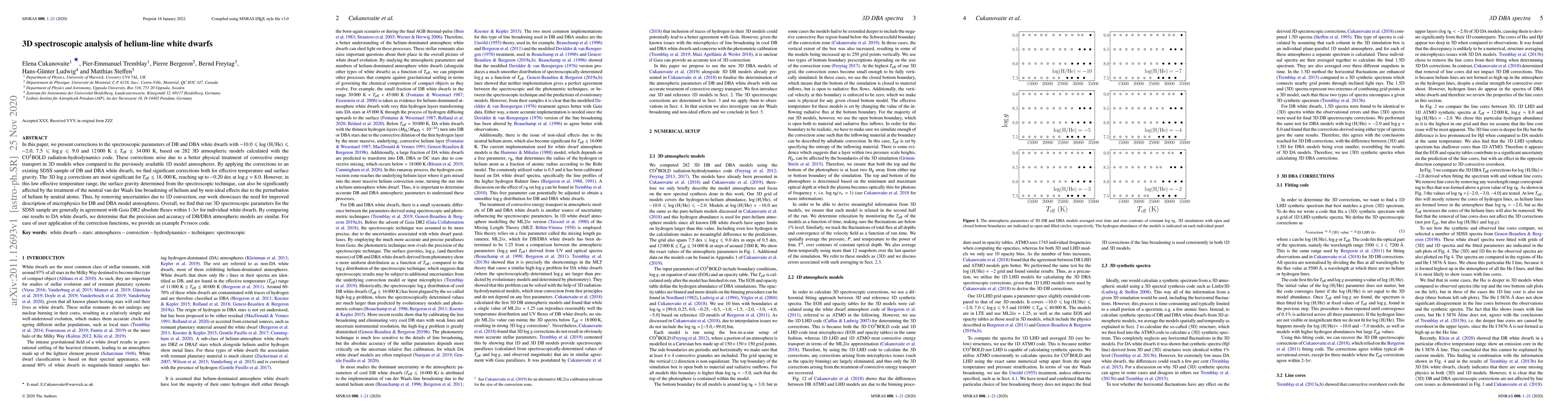 This paper presents 3D spectroscopic corrections for DB and DBA helium-line white dwarfs, showing significant improvements in effective temperature and surface gravity due to better convective energy transport modeling compared to 1D models. The 3D corrections are most impactful for lower effective temperatures, highlighting the need for enhanced microphysics in model atmospheres.