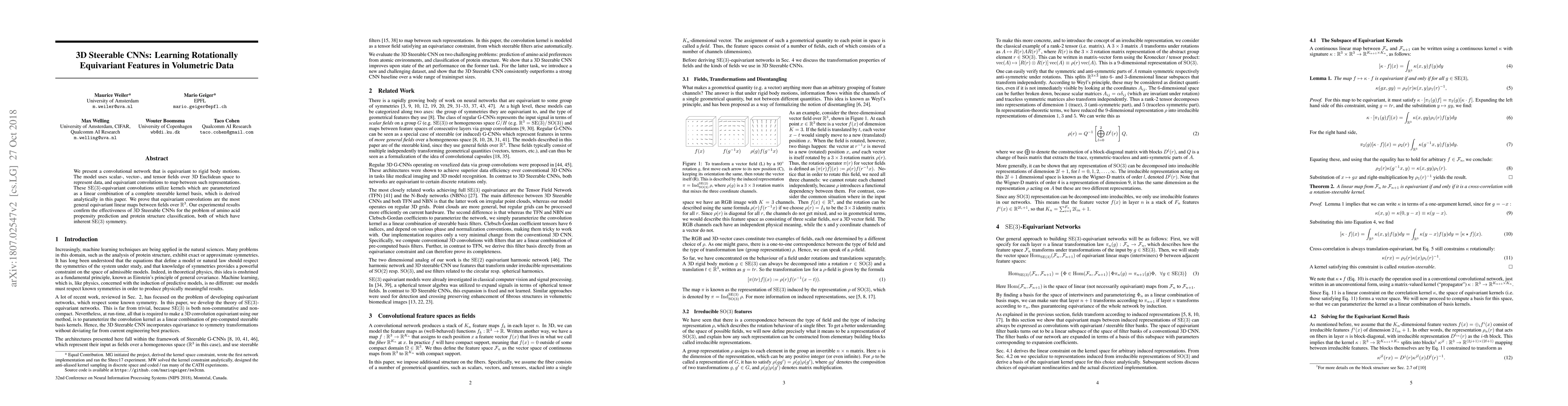 This paper introduces a 3D steerable convolutional neural network (CNN) that learns rotationally equivariant features for volumetric data, employing equivariant convolutions based on a steerable kernel basis. The model demonstrates effectiveness in amino acid propensity prediction and protein structure classification tasks.