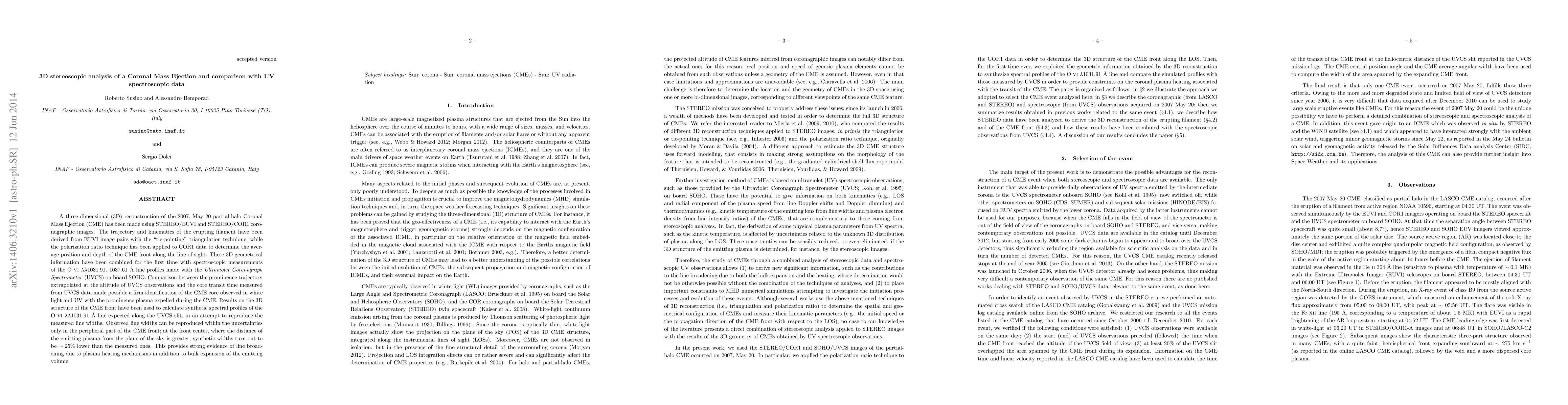 This study reconstructs the 3D structure of a 2007 CME using STEREO/EUVI and COR1 data, and compares it with UVCS spectroscopic data. The analysis reveals that while the CME's peripheral regions show expected line widths, the central region exhibits broader lines, suggesting additional heating mechanisms beyond bulk expansion.