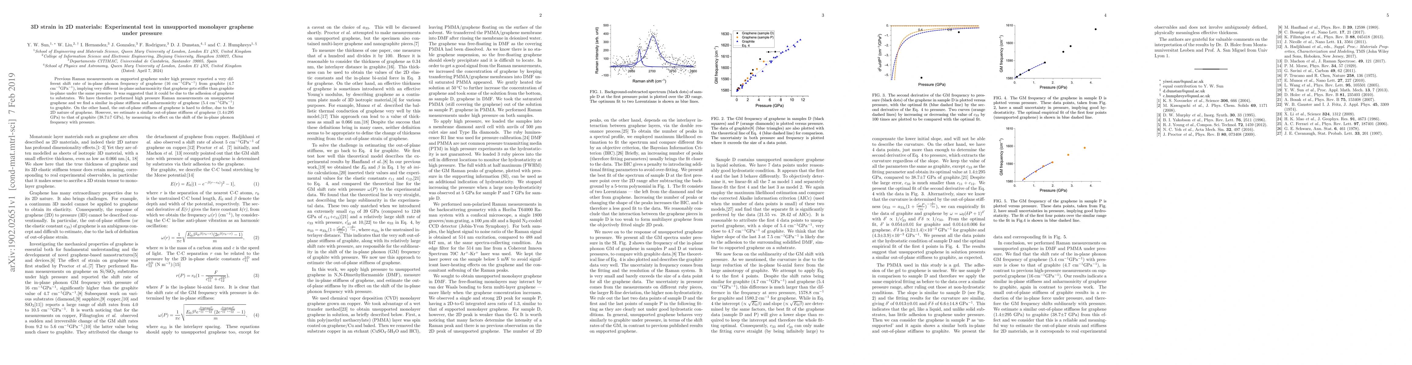 Previous Raman measurements on supported graphene under high pressure reported a very different shift rate of in-plane phonon frequency of graphene (16 cm$^{-1}$GPa$^{-1}$) from graphite (4.7 cm$^{-1}$GPa$^{-1}$), implying very different in-plane anharmonicity that graphene gets stiffer than graphite in-plane under the same pressure. It was suggested that it could be due to the adhesion of graphene to substrates. We have therefore performed high pressure Raman measurements on unsupported graphene and we find a similar in-plane stiffness and anharmonicity of graphene (5.4 cm$^{-1}$GPa$^{-1}$) to graphite. On the other hand, the out-of-plane stiffness of graphene is hard to define, due to the 2D nature of graphene. However, we estimate a similar out-of-plane stiffness of graphene (1.4$\pm$295 GPa) to that of graphite (38.7$\pm$7 GPa), by measuring its effect on the shift of the in-plane phonon frequency with pressure.