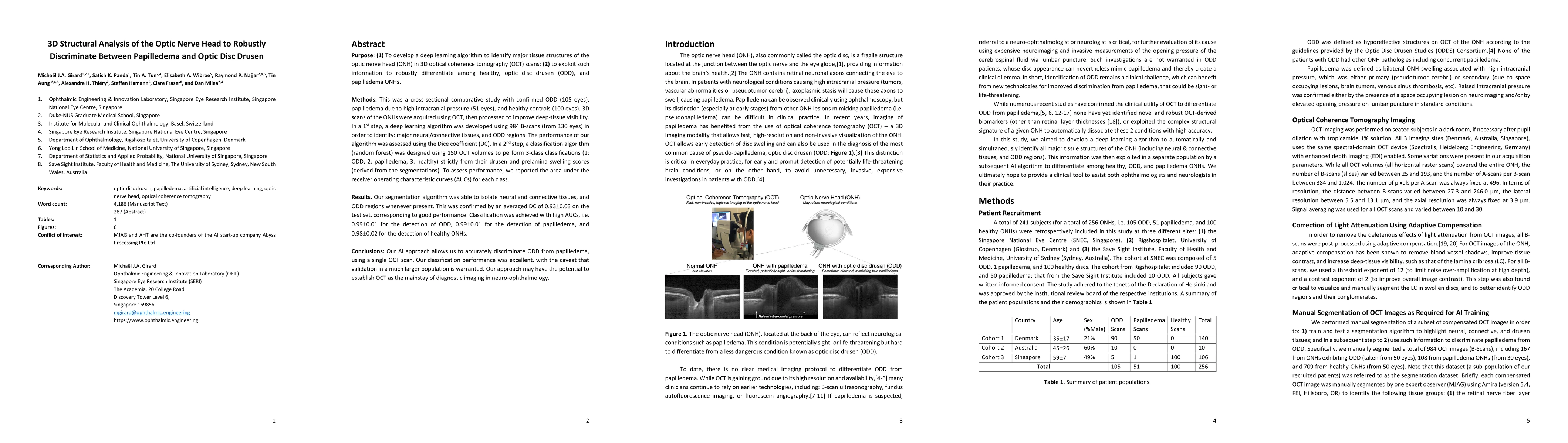 This paper develops a deep learning algorithm to segment and classify 3D OCT scans of the optic nerve head, distinguishing between optic disc drusen, papilledema, and healthy controls. The algorithm achieved high accuracy with an average Dice coefficient of 0.93 and excellent classification performance (AUCs up to 0.99), suggesting potential for OCT to become a primary diagnostic tool in neuro-ophthalmology.