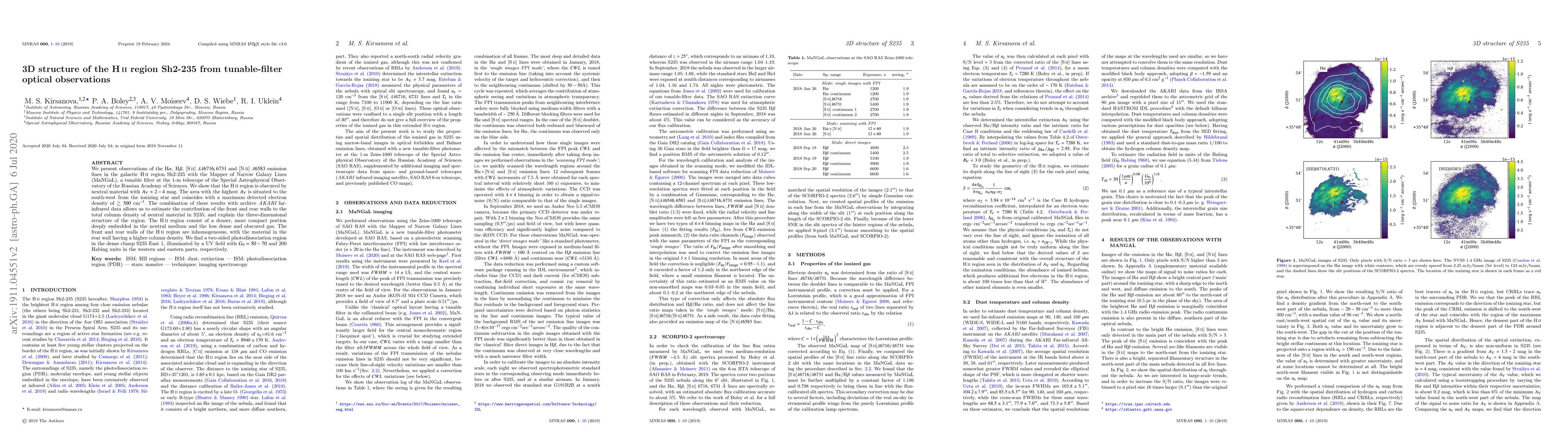 We present observations of the H-alpha, H-beta, [SII] 6716, 6731 and [NII] 6583 emission lines in the galactic HII region Sh2-235 with the Mapper of Narrow Galaxy Lines (MaNGaL), a tunable filter at the 1-m telescope of Special Astrophysical Observatory of the Russian Academy of Sciences. We show that the HII region is obscured by neutral material with AV = 2-4 mag. The area with the highest AV is situated to the south-west from the ionizing star and coincides with a maximum detected electron density of >=300 cm(-3). The combination of these results with archive AKARI far-infrared data allows us to estimate the contribution of the front and rear walls to the total column density of neutral material in S235, and explain the three-dimensional structure of the region. The HII region consist of a denser, more compact portion deeply embedded in the neutral medium and the less dense and obscured gas. The front and rear walls of the HII region are inhomogeneous, with the material in the rear wall having a higher column density. We find a two-sided photodissociation region in the dense clump S235 East 1, illuminated by a UV field with G0=50-70 and 200 Habing units in the western and eastern parts, respectively.