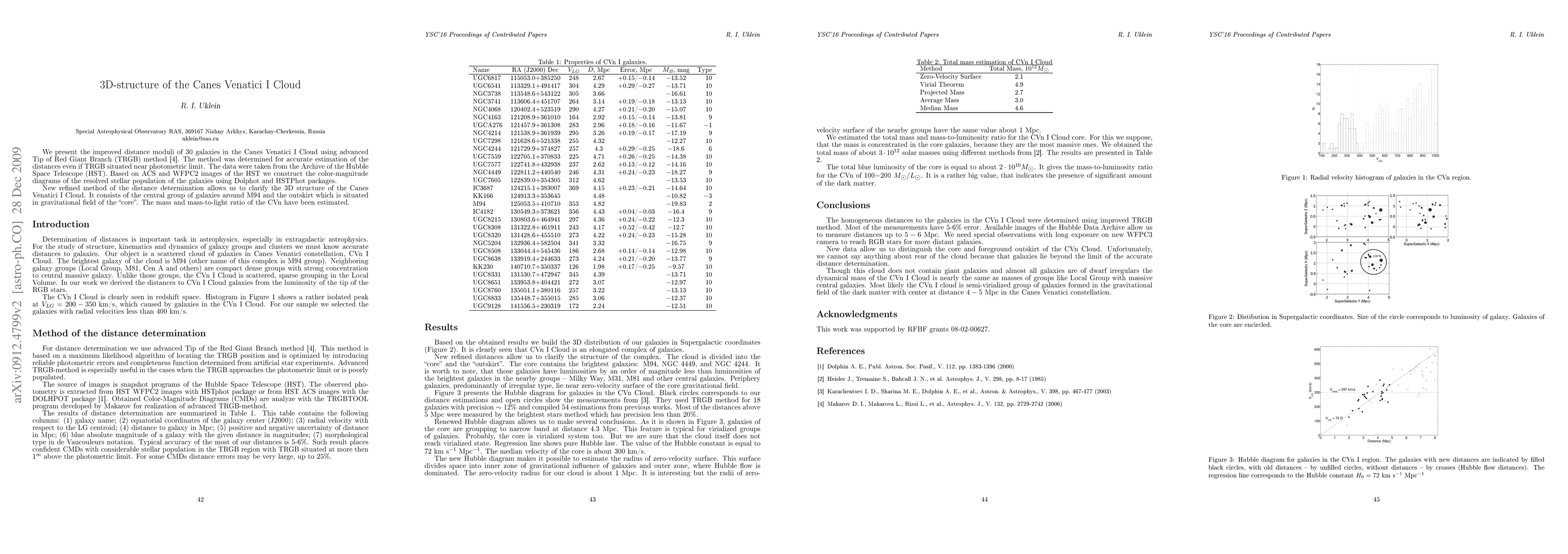 We present the improved distance moduli of 30 galaxies in the Canes Venatici I Cloud using advanced Tip of Red Giant Branch (TRGB) method (Makarov et.al. 2006). The method was determined for accurate estimation of the distances even if TRGB situated near photometric limit. The data were taken from the Archive of the Hubble Space Telescope (HST). Based on ACS and WFPC2 images of the HST we construct the color-magnitude diagrams of the resolved stellar population of the galaxies using Dolphot and HSTPhot packages. New refined method of the distance determination allows us to clarify the 3D structure of the Canes Venatici I Cloud. It consists of the central group of galaxies around M94 and the outskirt which is situated in gravitational field of the "core". The mass and mass-to-light ratio of the CVn have been estimated.