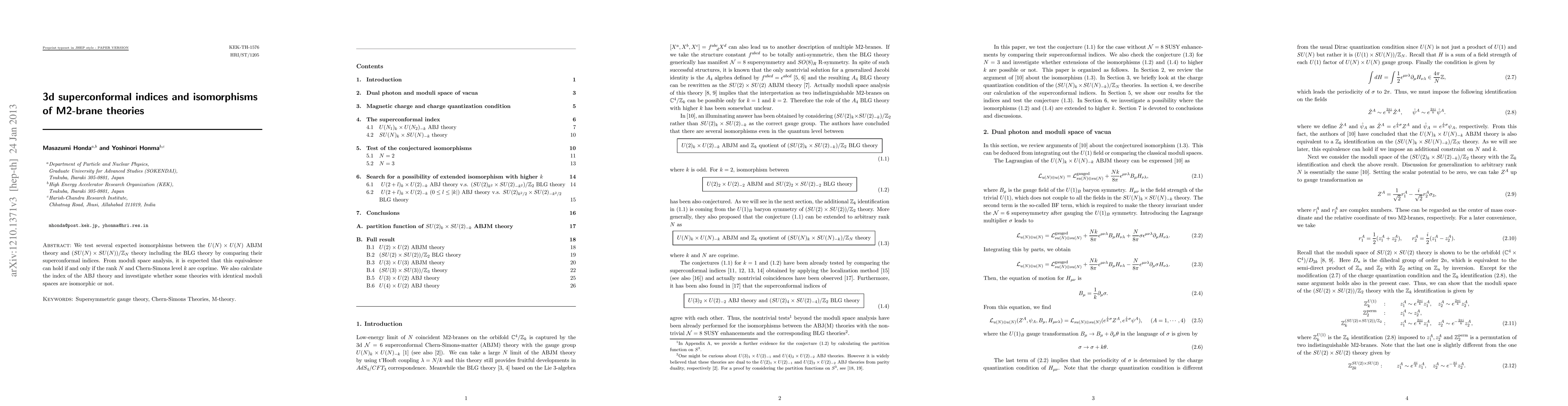 Researchers compared superconformal indices of various M2-brane theories to test isomorphisms between ABJM and BLG theories, finding that equivalence holds when rank N and Chern-Simons level k are coprime. The study also investigated other theories with identical moduli spaces for potential isomorphism.