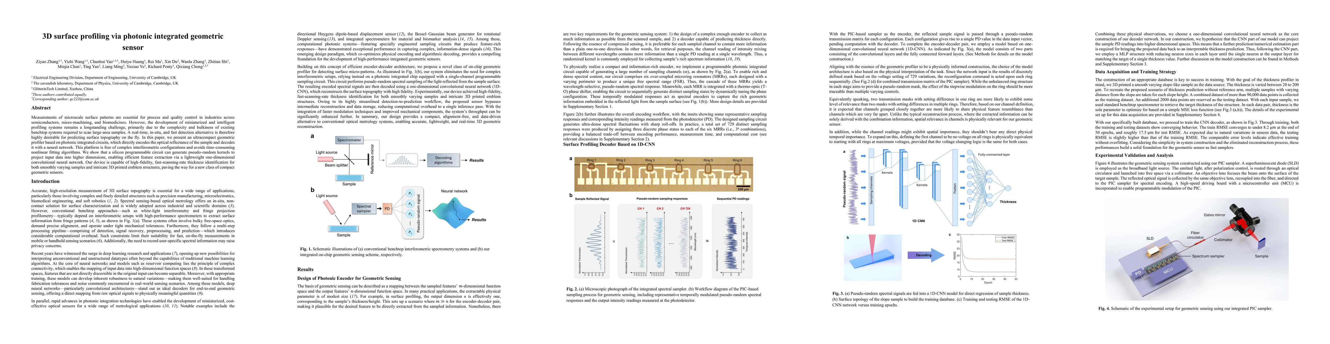 Measurements of microscale surface patterns are essential for process and quality control in industries across semiconductors, micro-machining, and biomedicines. However, the development of miniaturized and intelligent profiling systems remains a longstanding challenge, primarily due to the complexity and bulkiness of existing benchtop systems required to scan large-area samples. A real-time, in-situ, and fast detection alternative is therefore highly desirable for predicting surface topography on the fly. In this paper, we present an ultracompact geometric profiler based on photonic integrated circuits, which directly encodes the optical reflectance of the sample and decodes it with a neural network. This platform is free of complex interferometric configurations and avoids time-consuming nonlinear fitting algorithms. We show that a silicon programmable circuit can generate pseudo-random kernels to project input data into higher dimensions, enabling efficient feature extraction via a lightweight one-dimensional convolutional neural network. Our device is capable of high-fidelity, fast-scanning-rate thickness identification for both smoothly varying samples and intricate 3D printed emblem structures, paving the way for a new class of compact geometric sensors.