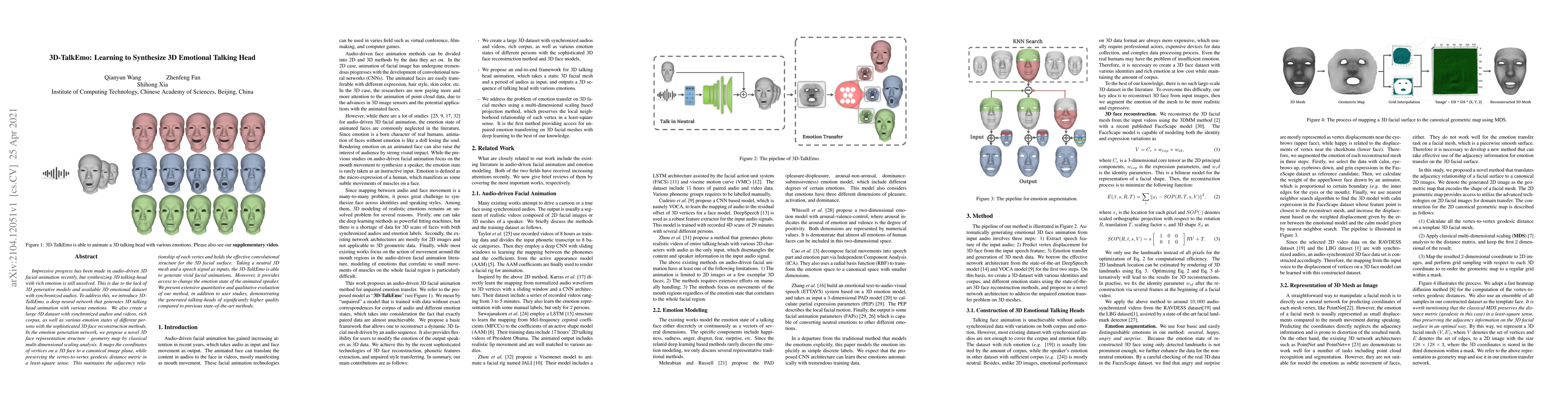 The paper introduces 3D-TalkEmo, a deep neural network for generating 3D talking head animations with various emotions, addressing the lack of 3D generative models and emotional datasets. It also presents a new 3D dataset with synchronized audios and videos, and employs a novel 3D face representation structure to maintain vertex adjacency and generate high-quality emotional facial animations.