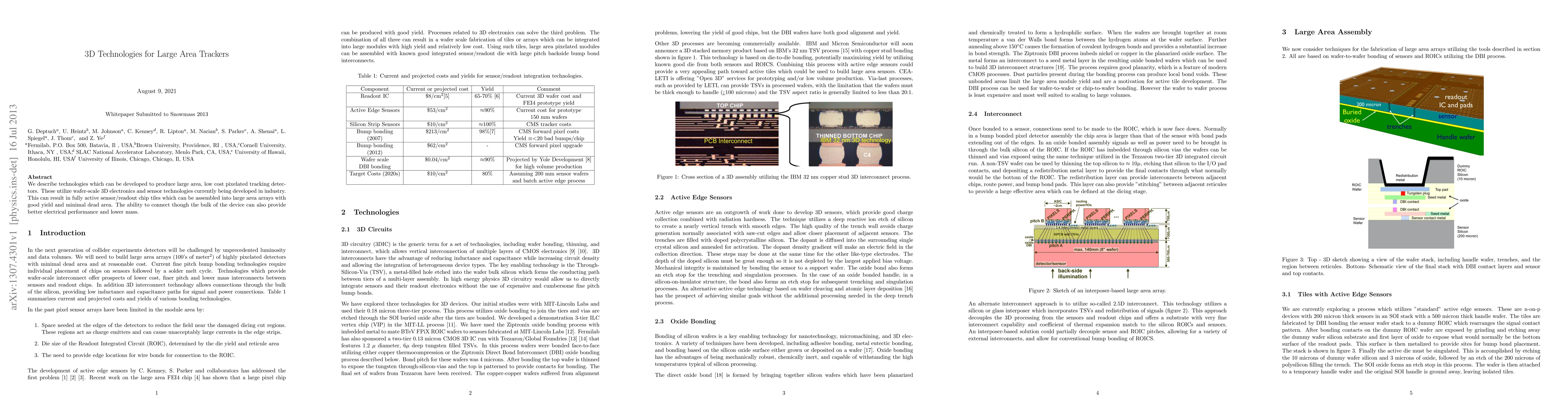 The paper discusses the development of large, low-cost pixelated tracking detectors using wafer-scale 3D electronics and sensors. These fully active sensor/readout chip tiles can form large area arrays with high yield and minimal dead area, offering improved electrical performance and reduced mass.