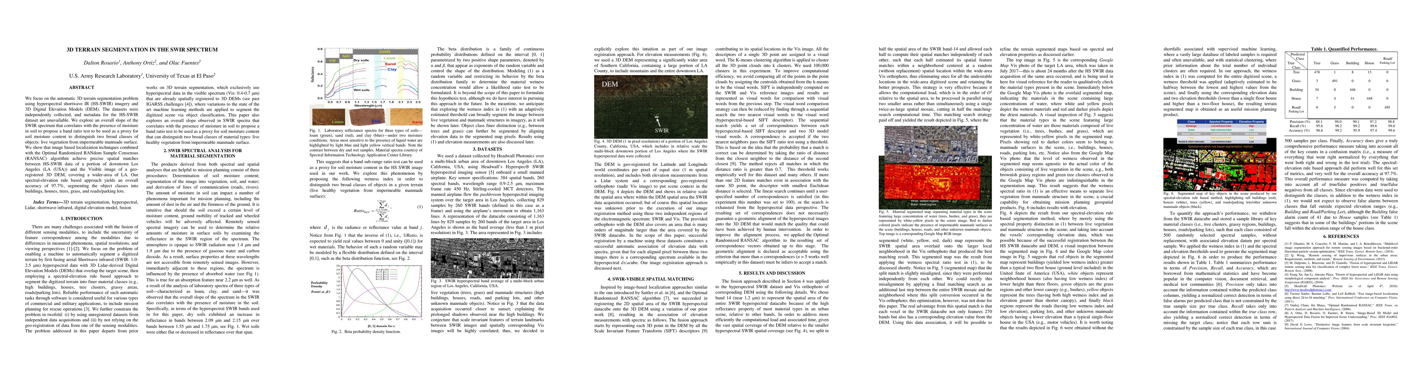 We focus on the automatic 3D terrain segmentation problem using hyperspectral shortwave IR (HS-SWIR) imagery and 3D Digital Elevation Models (DEM). The datasets were independently collected, and metadata for the HS-SWIR dataset are unavailable. We explore an overall slope of the SWIR spectrum that correlates with the presence of moisture in soil to propose a band ratio test to be used as a proxy for soil moisture content to distinguish two broad classes of objects: live vegetation from impermeable manmade surface. We show that image based localization techniques combined with the Optimal Randomized RANdom Sample Consensus (RANSAC) algorithm achieve precise spatial matches between HS-SWIR data of a portion of downtown Los Angeles (LA (USA)) and the Visible image of a geo-registered 3D DEM, covering a wider-area of LA. Our spectral-elevation rule based approach yields an overall accuracy of 97.7%, segmenting the object classes into buildings, houses, trees, grass, and roads/parking lots.