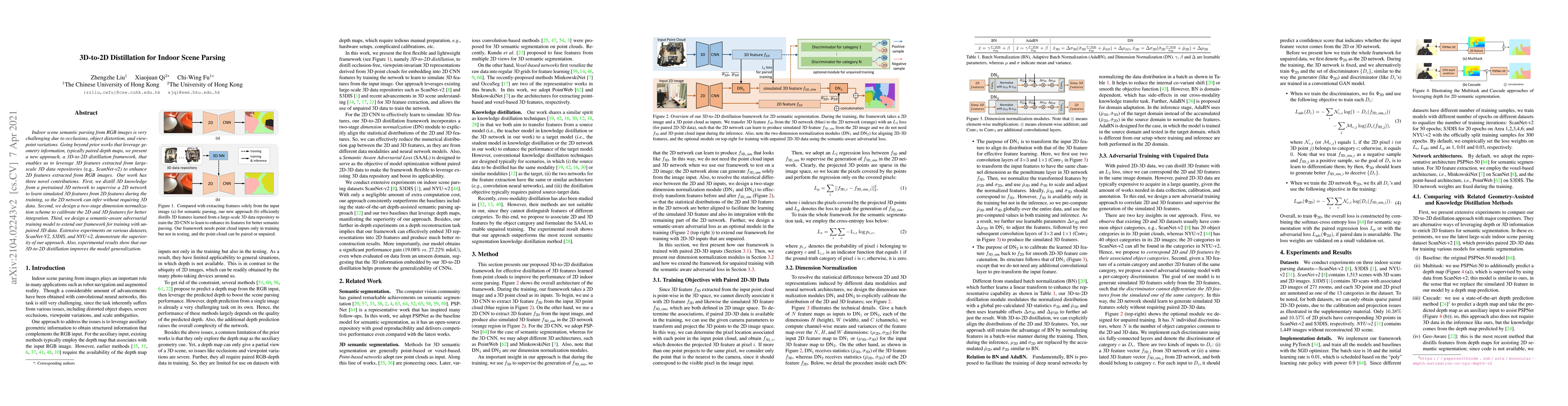 This paper introduces a 3D-to-2D distillation framework to enhance indoor scene parsing from RGB images by leveraging 3D features from large-scale 3D datasets. The approach distills 3D knowledge to simulate 3D features from 2D images, normalizes dimensions for better feature integration, and employs semantic-aware adversarial training for unpaired 3D data, achieving superior performance and improved generalization.