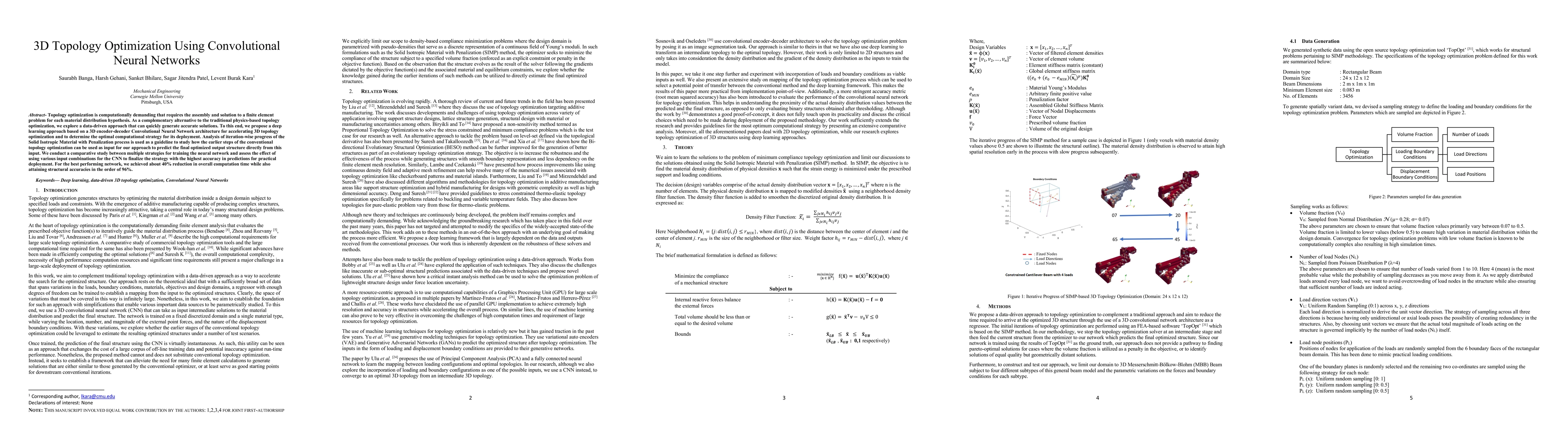 This paper proposes a 3D topology optimization method using a Convolutional Neural Network (CNN) to accelerate the process and achieve accurate results. The study compares various training strategies and input combinations for the CNN, achieving a 40% reduction in computation time with 96% structural accuracy.
