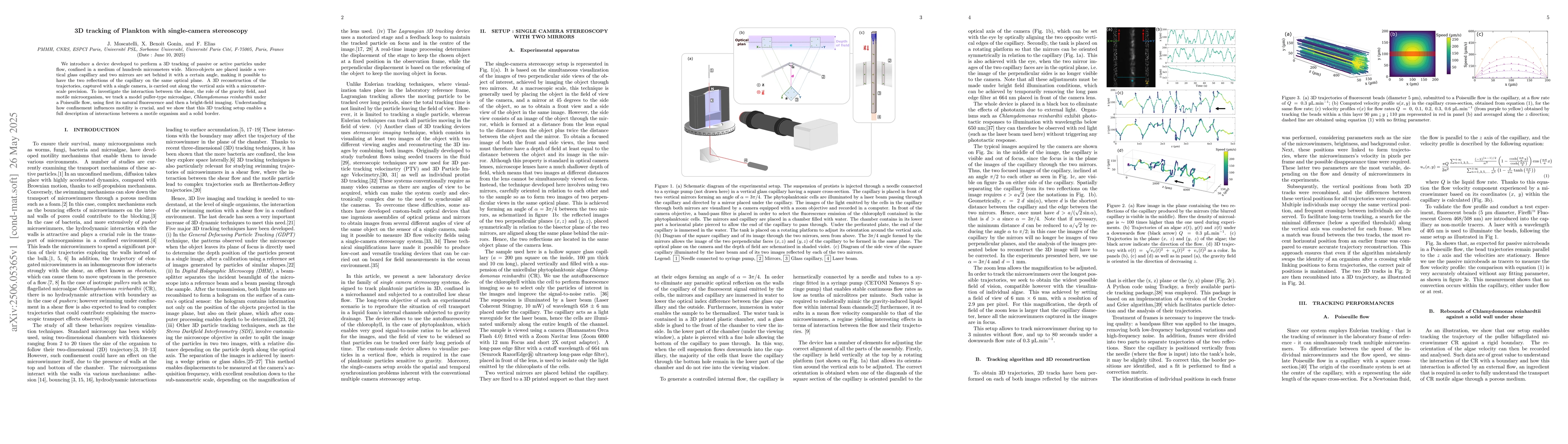 We introduce a device developed to perform a 3D tracking of passive or active particles under flow, confined in a medium of hundreds micrometers wide. Micro-objects are placed inside a vertical glass capillary and two mirrors are set behind it with a certain angle, making it possible to have the two reflections of the capillary on the same optical plane. A 3D reconstruction of the trajectories, captured with a single camera, is carried out along the vertical axis with a micrometer-scale precision. To investigate the interaction between the shear, the role of the gravity field, and motile microorganism, we track a model puller-type microalgae, Chlamydomonas reinhardtii under a Poiseuille flow, using first its natural fluorescence and then a bright-field imaging. Understanding how confinement influences motility is crucial, and we show that this 3D tracking setup enables a full description of interactions between a motile organism and a solid border.