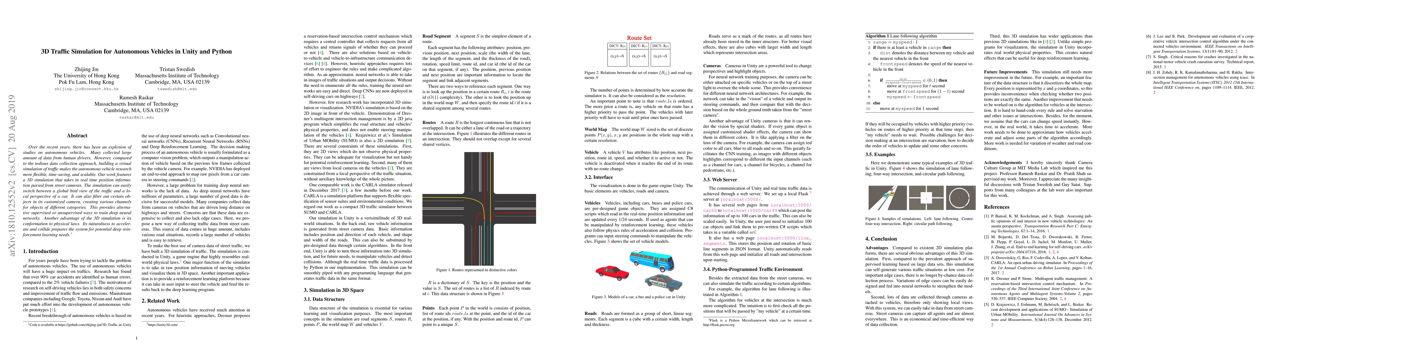 Over the recent years, there has been an explosion of studies on autonomous vehicles. Many collected large amount of data from human drivers. However, compared to the tedious data collection approach, building a virtual simulation of traffic makes the autonomous vehicle research more flexible, time-saving, and scalable. Our work features a 3D simulation that takes in real time position information parsed from street cameras. The simulation can easily switch between a global bird view of the traffic and a local perspective of a car. It can also filter out certain objects in its customized camera, creating various channels for objects of different categories. This provides alternative supervised or unsupervised ways to train deep neural networks. Another advantage of the 3D simulation is its conformation to physical laws. Its naturalness to accelerate and collide prepares the system for potential deep reinforcement learning needs.