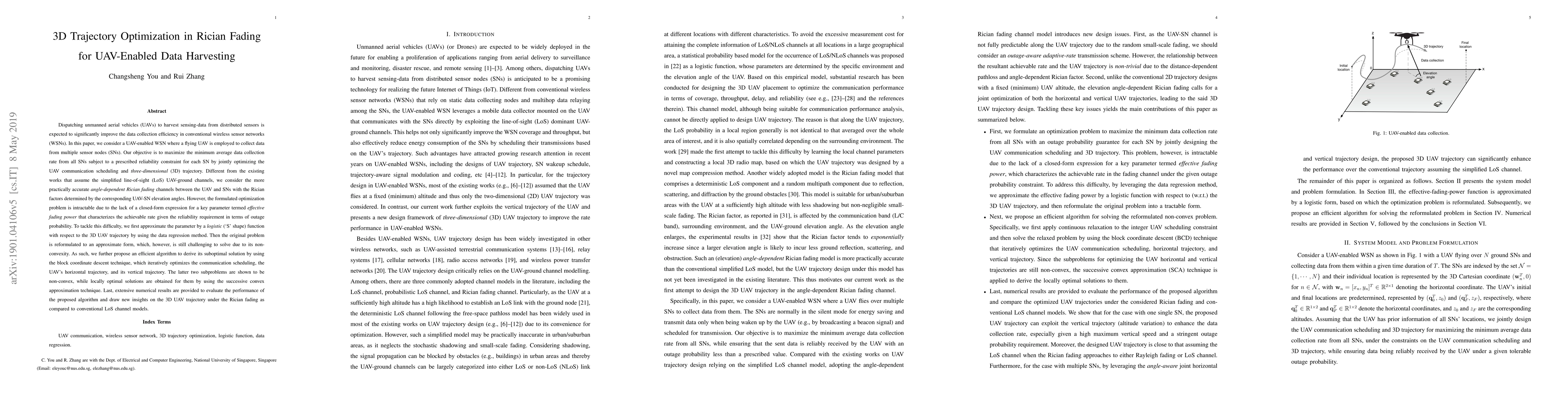 This paper optimizes 3D UAV trajectories for data collection in a wireless sensor network under Rician fading, aiming to maximize the minimum average data collection rate subject to reliability constraints. It addresses the non-convex optimization problem by approximating the effective fading power and employing a block coordinate descent algorithm with successive convex approximation to achieve a suboptimal solution.