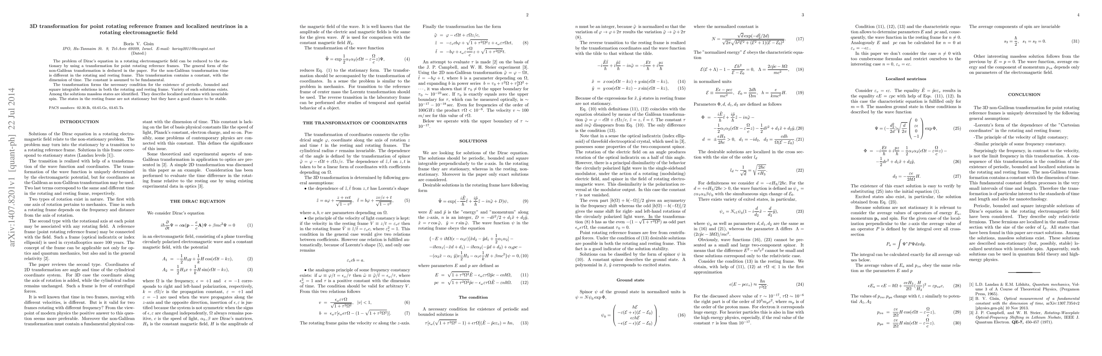 The problem of Dirac's equation in a rotating electromagnetic field can be reduced to the stationary by using a transformation for point rotating reference frames. The general form of the non-Galilean transformation is deduced in the paper. For the non-Galilean transformation time is different in the rotating and resting frame. This transformation contains a constant, with the dimension of time. The constant is assumed to be fundamental. The transformation forms the necessary condition for the existence of periodic, bounded and square integrable solutions in both the rotating and resting frame. Variety of such solutions exists. Among the solutions massless states are identified. They describe localized neutrinos with invariable spin. The states in the resting frame are not stationary but they have a good chance to be stable.