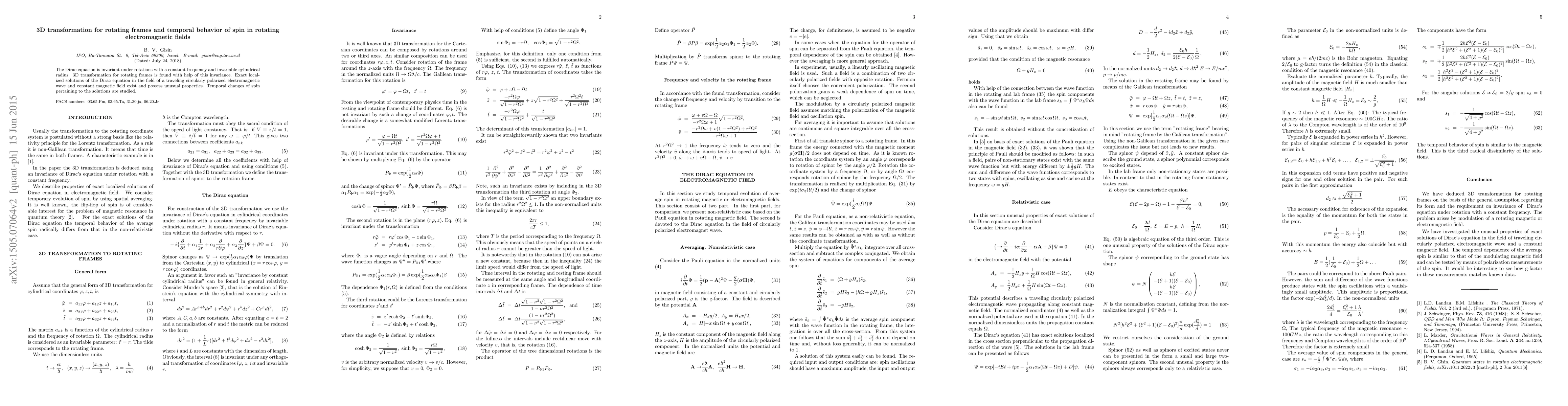 This paper explores the 3D transformations for rotating frames using the invariance of the Dirac equation under constant frequency rotations. It identifies exact localized solutions of the Dirac equation in rotating electromagnetic fields and investigates the unusual temporal behavior of spin associated with these solutions.