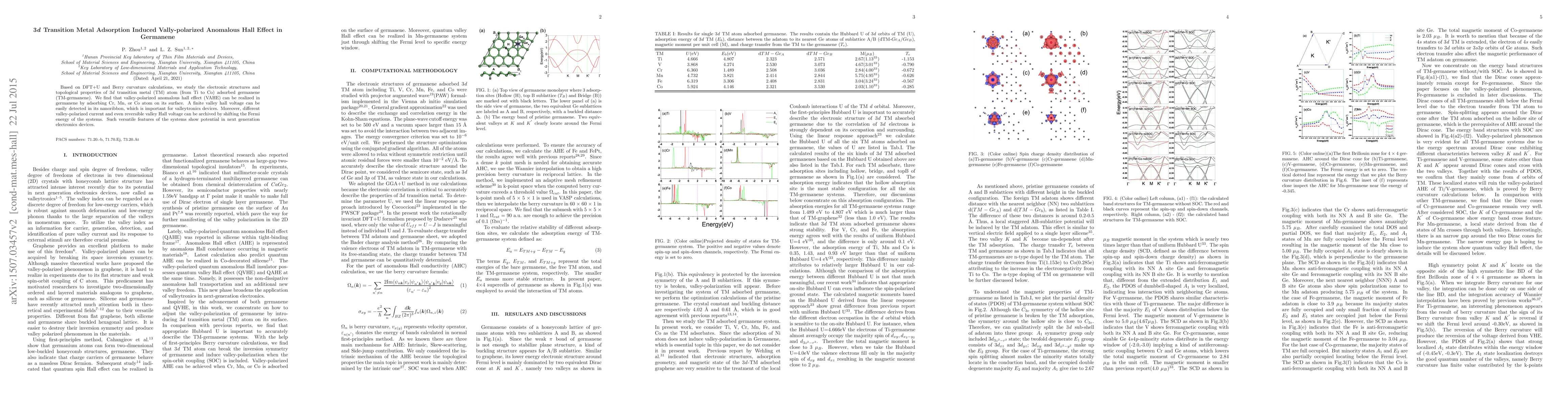 This study explores the electronic structures and topological properties of germanene with adsorbed 3d transition metals (Ti to Co) using DFT+U and Berry curvature calculations. It reveals that Cr, Mn, or Co adsorption can induce a valley-polarized anomalous Hall effect in germanene, with potential applications in valleytronics, and suggests that the Fermi energy can be manipulated to achieve reversible valley Hall voltage.