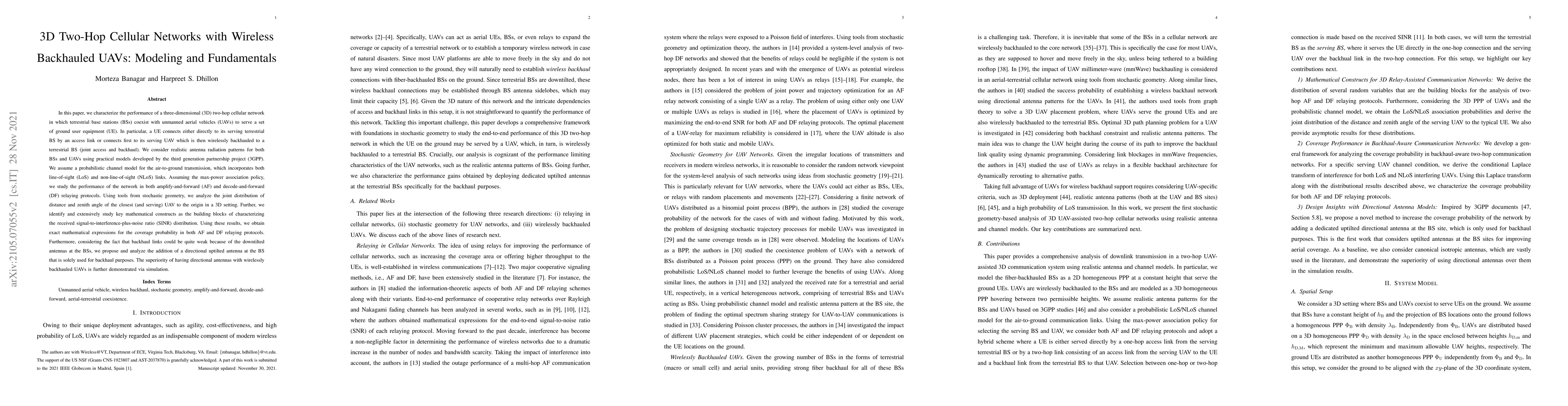 In this paper, we characterize the performance of a three-dimensional (3D) two-hop cellular network in which terrestrial base stations (BSs) coexist with unmanned aerial vehicles (UAVs) to serve a set of ground user equipment (UE). In particular, a UE connects either directly to its serving terrestrial BS by an access link or connects first to its serving UAV which is then wirelessly backhauled to a terrestrial BS (joint access and backhaul). We consider realistic antenna radiation patterns for both BSs and UAVs using practical models developed by the third generation partnership project (3GPP). We assume a probabilistic channel model for the air-to-ground transmission, which incorporates both line-of-sight (LoS) and non-line-of-sight (NLoS) links. Assuming the max-power association policy, we study the performance of the network in both amplify-and-forward (AF) and decode-and-forward (DF) relaying protocols. Using tools from stochastic geometry, we analyze the joint distribution of distance and zenith angle of the closest (and serving) UAV to the origin in a 3D setting. Further, we identify and extensively study key mathematical constructs as the building blocks of characterizing the received signal-to-interference-plus-noise ratio (SINR) distribution. Using these results, we obtain exact mathematical expressions for the coverage probability in both AF and DF relaying protocols. Furthermore, considering the fact that backhaul links could be quite weak because of the downtilted antennas at the BSs, we propose and analyze the addition of a directional uptilted antenna at the BS that is solely used for backhaul purposes. The superiority of having directional antennas with wirelessly backhauled UAVs is further demonstrated via simulation.