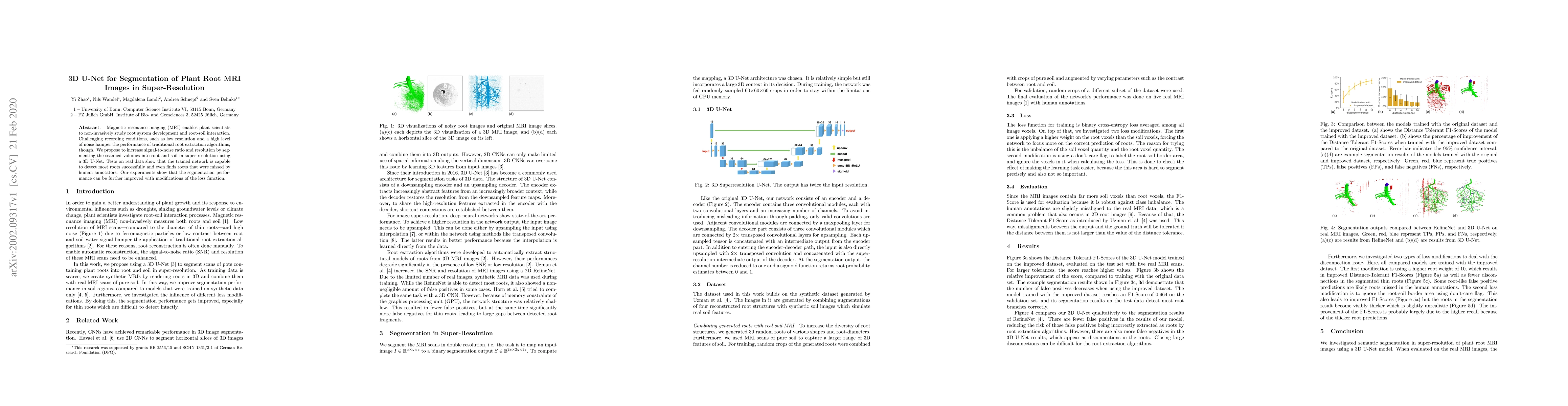 This paper proposes a 3D U-Net for super-resolution segmentation of plant root MRI images, improving signal-to-noise ratio and resolution. The trained network successfully detects roots, including those missed by human annotators, and performance can be enhanced with loss function modifications.