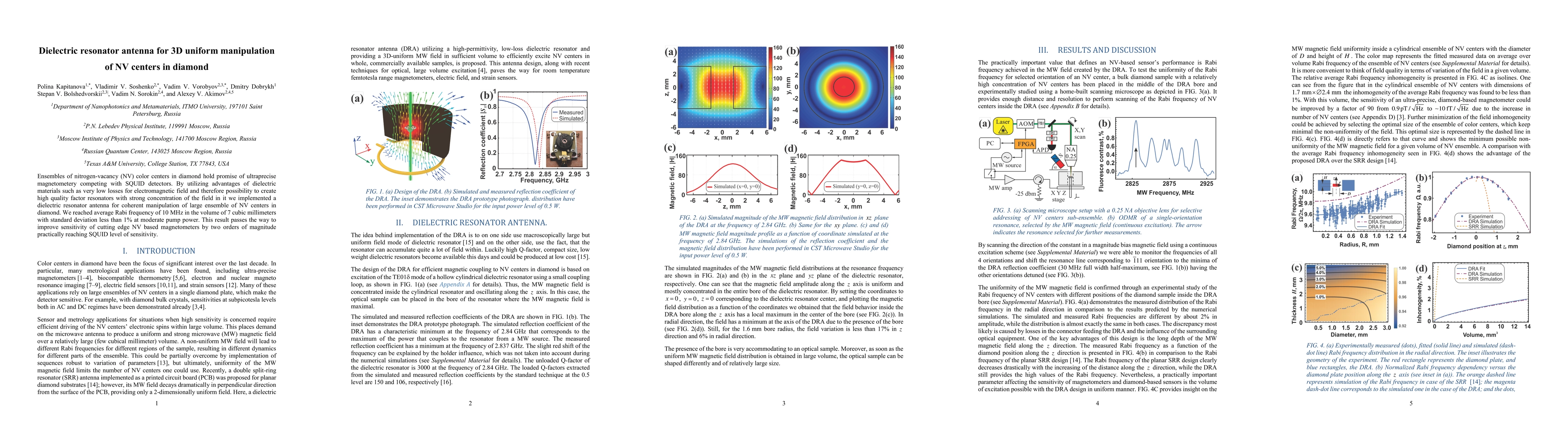 This paper presents a method for coherent manipulation of nitrogen-vacancy (NV) centers in diamond using a dielectric resonator antenna, achieving an average Rabi frequency of 10 MHz with high uniformity and low loss. This advancement could enhance the sensitivity of NV-based magnetometers to SQUID levels.