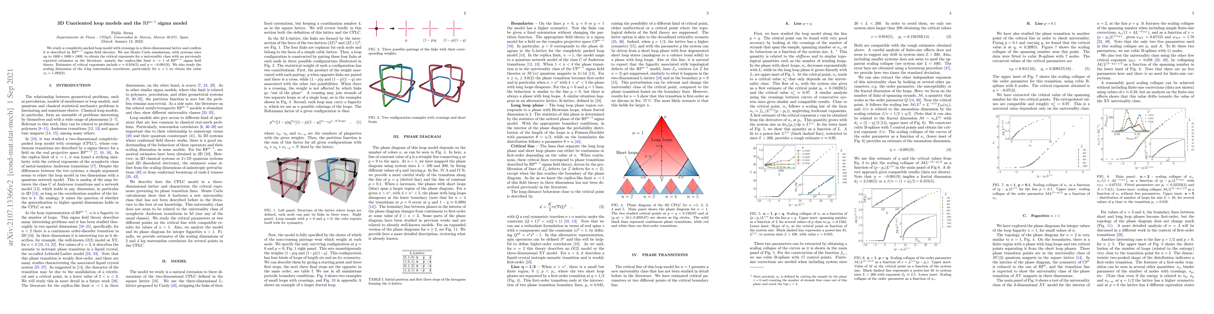 This paper investigates a 3D loop model with crossings, confirming its equivalence to $\mathrm{RP}^{n-1}$ sigma field theories. Monte Carlo simulations reveal critical exponents, including $\nu=0.918(5)$ and $\eta=-0.091(9)$, for the previously unstudied $n\rightarrow1$ limit, along with a scaling dimension of $x_4=1.292(8)$ for 4-leg watermelon correlators.