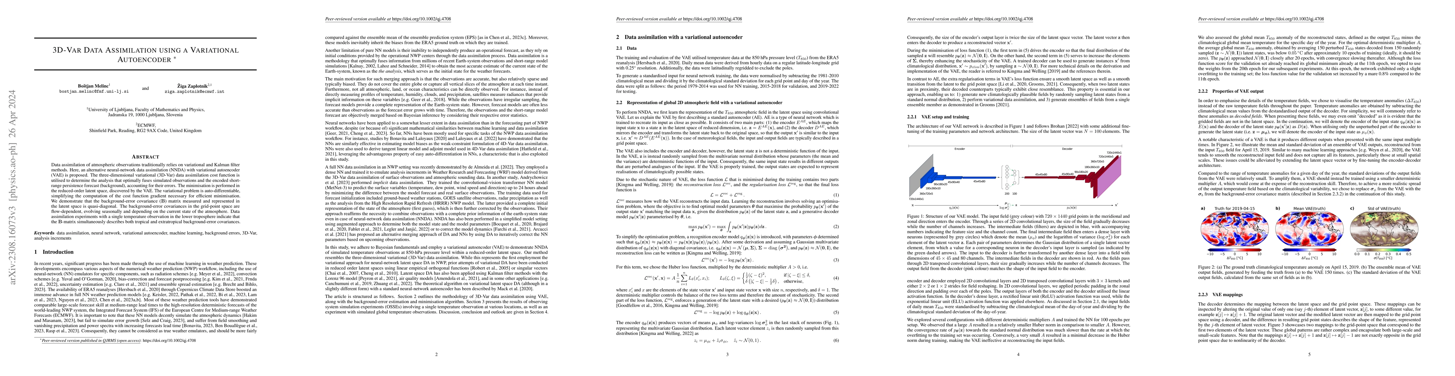 Data assimilation of atmospheric observations traditionally relies on variational and Kalman filter methods. Here, an alternative neural-network data assimilation (NNDA) with variational autoencoder (VAE) is proposed. The three-dimensional variational (3D-Var) data assimilation cost function is utilised to determine the analysis that optimally fuses simulated observations and the encoded short-range persistence forecast (background), accounting for their errors. The minimisation is performed in the reduced-order latent space, discovered by the VAE. The variational problem is auto-differentiable, simplifying the computation of the cost function gradient necessary for efficient minimisation. We demonstrate that the background-error covariance ($\mathbf{B}$) matrix measured and represented in the latent space is quasi-diagonal. The background-error covariances in the grid-point space are flow-dependent, evolving seasonally and depending on the current state of the atmosphere. Data assimilation experiments with a single temperature observation in the lower troposphere indicate that the $\mathbf{B}$-matrix simultaneously describes both tropical and extratropical background-error covariances.