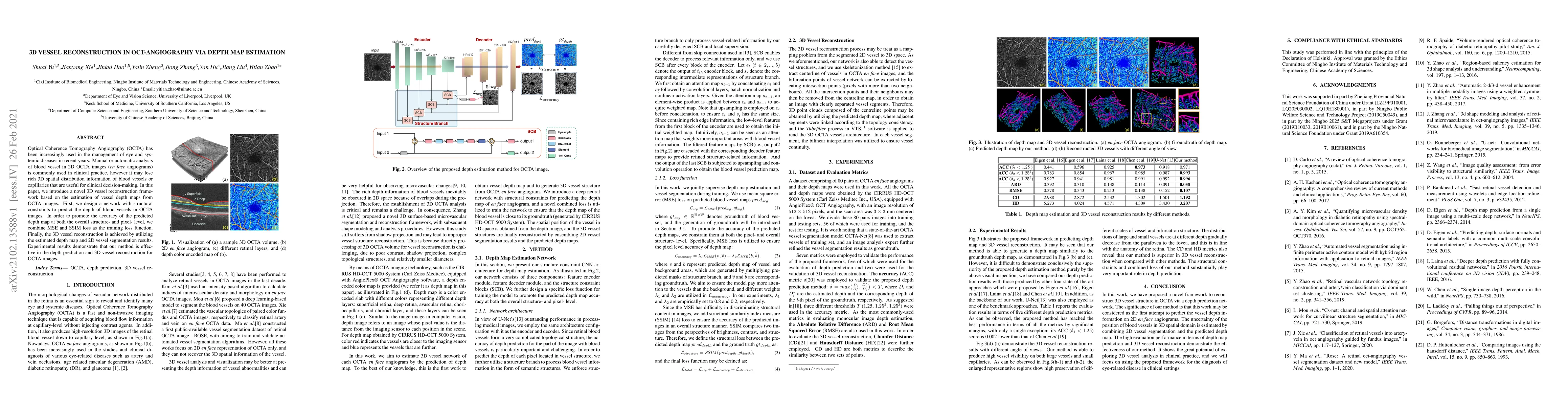 This paper proposes a novel framework for 3D vessel reconstruction from Optical Coherence Tomography Angiography (OCTA) images using depth map estimation. The method employs a network with structural constraints to predict vessel depth, combining MSE and SSIM losses for improved accuracy, and reconstructs 3D vessels from the estimated depth map and 2D segmentation results.