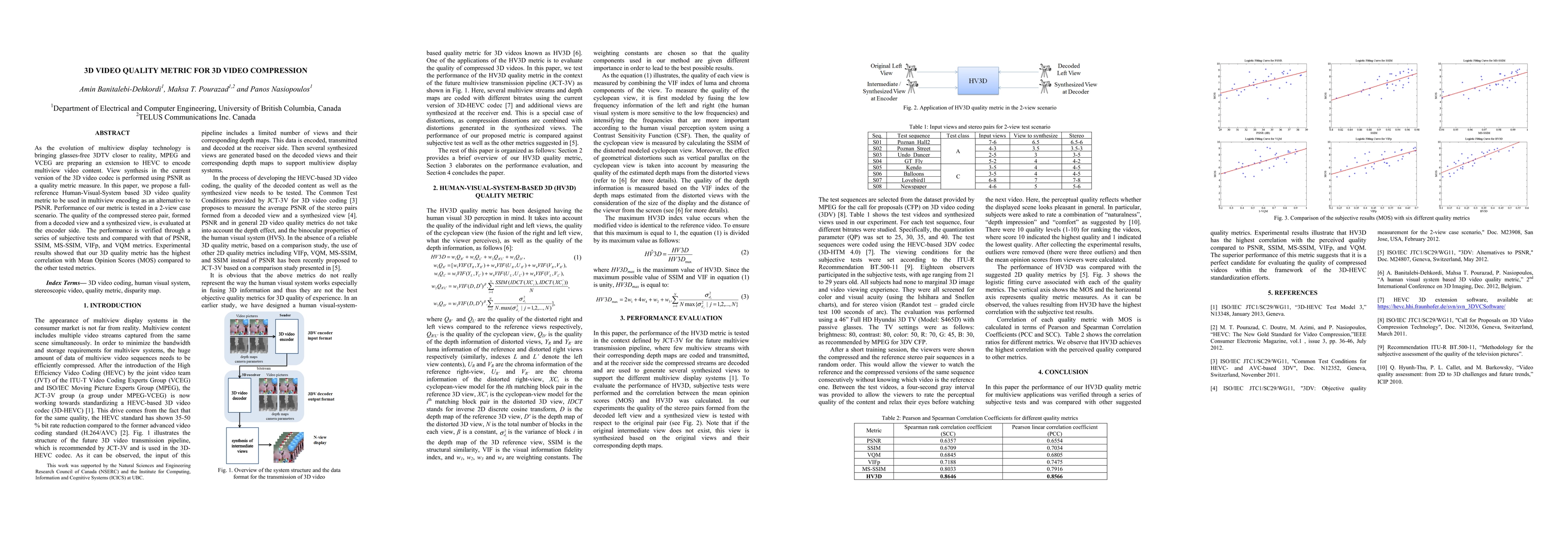 As the evolution of multiview display technology is bringing glasses-free 3DTV closer to reality, MPEG and VCEG are preparing an extension to HEVC to encode multiview video content. View synthesis in the current version of the 3D video codec is performed using PSNR as a quality metric measure. In this paper, we propose a full- reference Human-Visual-System based 3D video quality metric to be used in multiview encoding as an alternative to PSNR. Performance of our metric is tested in a 2-view case scenario. The quality of the compressed stereo pair, formed from a decoded view and a synthesized view, is evaluated at the encoder side. The performance is verified through a series of subjective tests and compared with that of PSNR, SSIM, MS-SSIM, VIFp, and VQM metrics. Experimental results showed that our 3D quality metric has the highest correlation with Mean Opinion Scores (MOS) compared to the other tested metrics.