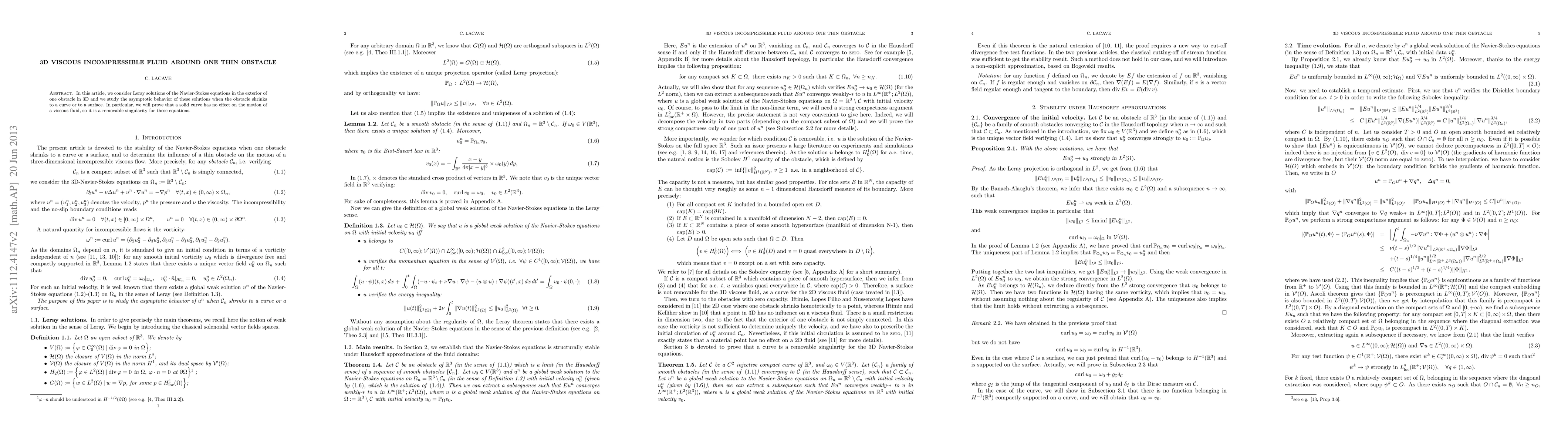 In this article, we consider Leray solutions of the Navier-Stokes equations in the exterior of one obstacle in 3D and we study the asymptotic behavior of these solutions when the obstacle shrinks to a curve or to a surface. In particular, we will prove that a solid curve has no effect on the motion of a viscous fluid, so it is a removable singularity for these equations.