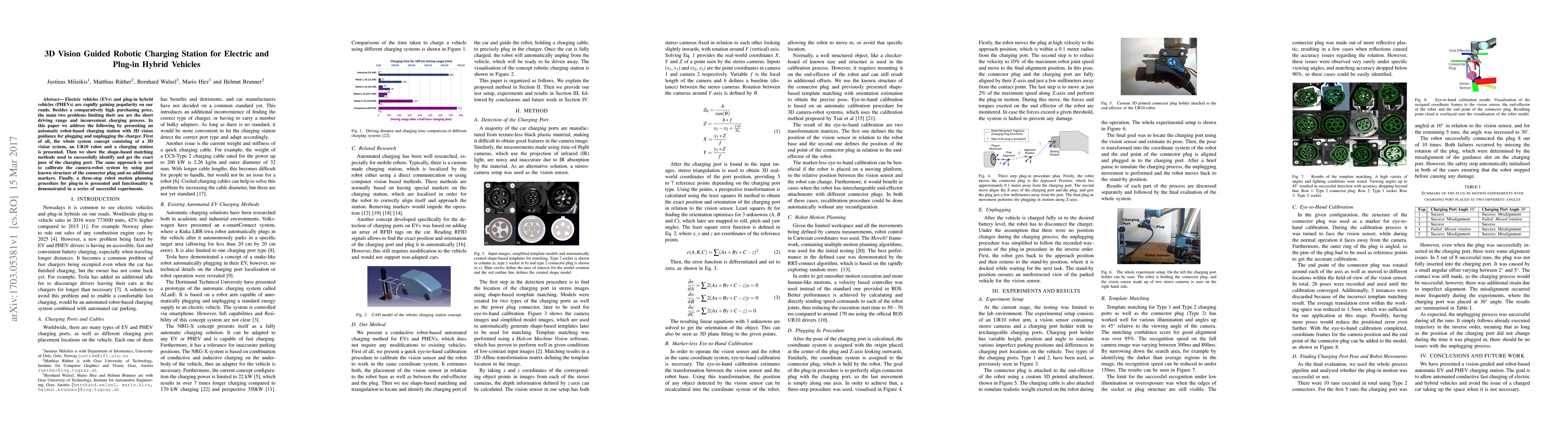 Electric vehicles (EVs) and plug-in hybrid vehicles (PHEVs) are rapidly gaining popularity on our roads. Besides a comparatively high purchasing price, the main two problems limiting their use are the short driving range and inconvenient charging process. In this paper we address the following by presenting an automatic robot-based charging station with 3D vision guidance for plugging and unplugging the charger. First of all, the whole system concept consisting of a 3D vision system, an UR10 robot and a charging station is presented. Then we show the shape-based matching methods used to successfully identify and get the exact pose of the charging port. The same approach is used to calibrate the camera-robot system by using just known structure of the connector plug and no additional markers. Finally, a three-step robot motion planning procedure for plug-in is presented and functionality is demonstrated in a series of successful experiments.
