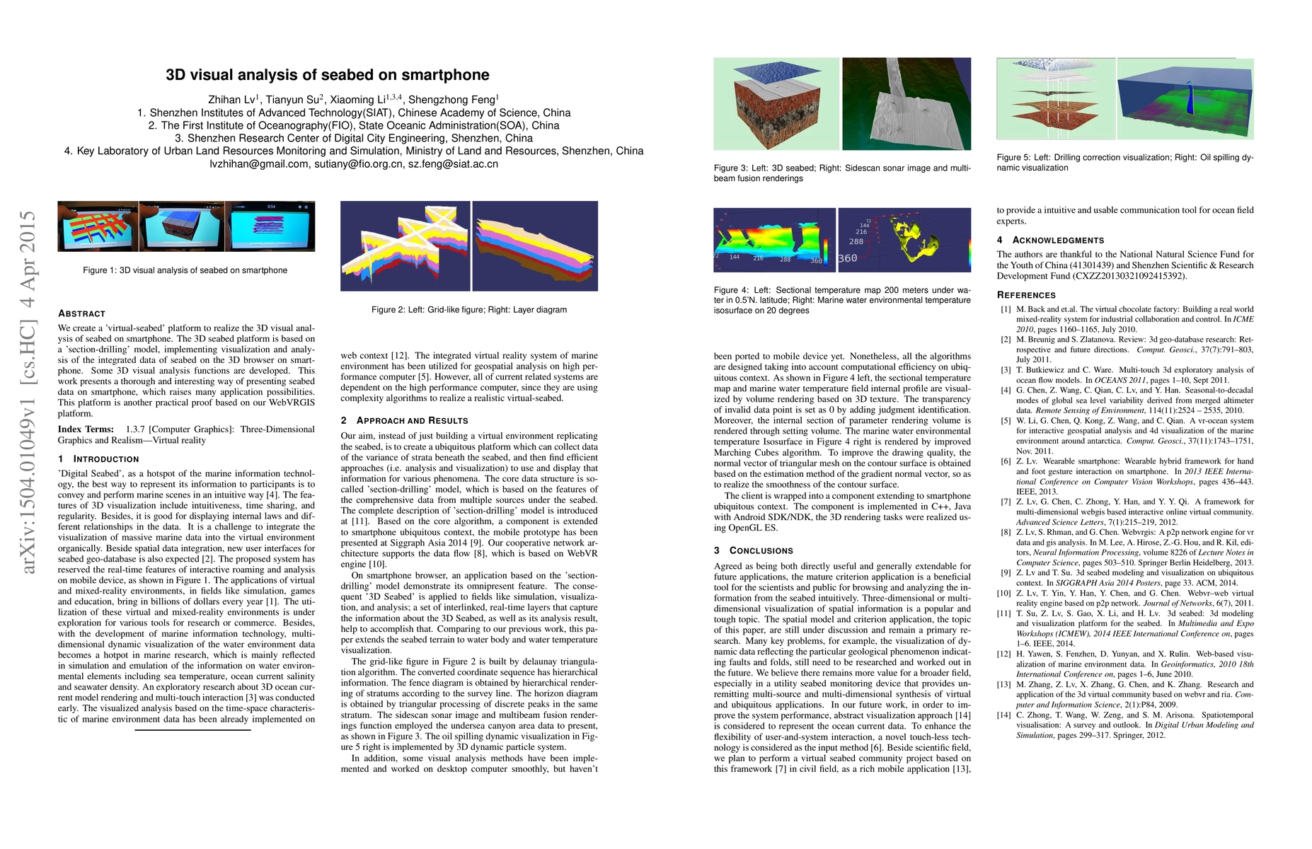 This research introduces a 'virtual-seabed' platform for 3D visual analysis of seabed data on smartphones, utilizing a 'section-drilling' model to integrate and visualize seabed data. The platform offers innovative 3D analysis functions, demonstrating practical applications of the WebVRGIS platform.