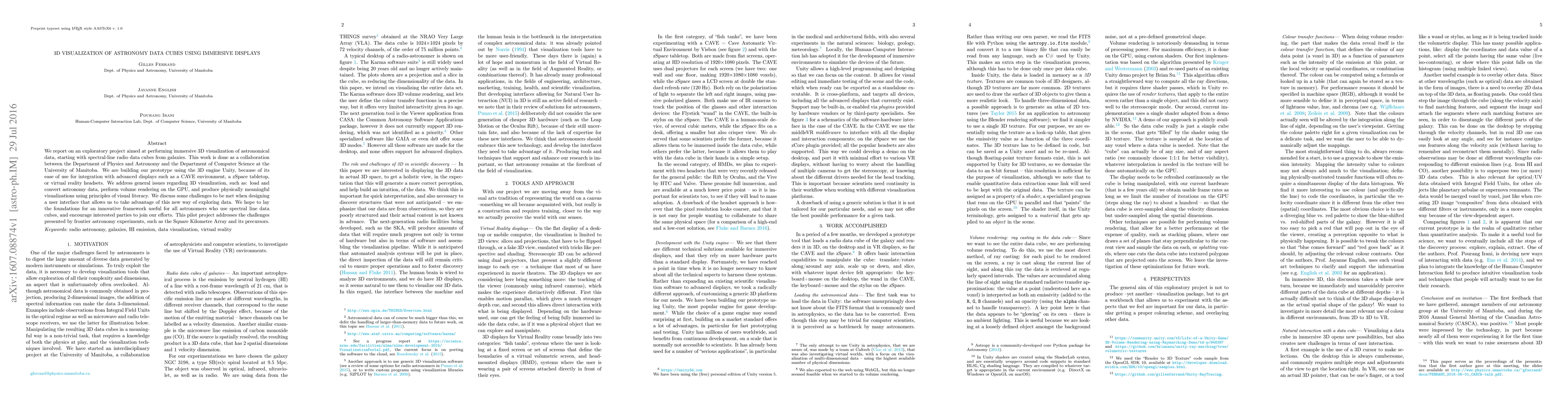 We report on an exploratory project aimed at performing immersive 3D visualization of astronomical data, starting with spectral-line radio data cubes from galaxies. This work is done as a collaboration between the Department of Physics and Astronomy and the Department of Computer Science at the University of Manitoba. We are building our prototype using the 3D engine Unity, because of its ease of use for integration with advanced displays such as a CAVE environment, a zSpace tabletop, or virtual reality headsets. We address general issues regarding 3D visualization, such as: load and convert astronomy data, perform volume rendering on the GPU, and produce physically meaningful visualizations using principles of visual literacy. We discuss some challenges to be met when designing a user interface that allows us to take advantage of this new way of exploring data. We hope to lay the foundations for an innovative framework useful for all astronomers who use spectral line data cubes, and encourage interested parties to join our efforts. This pilot project addresses the challenges presented by frontier astronomy experiments, such as the Square Kilometre Array and its precursors.