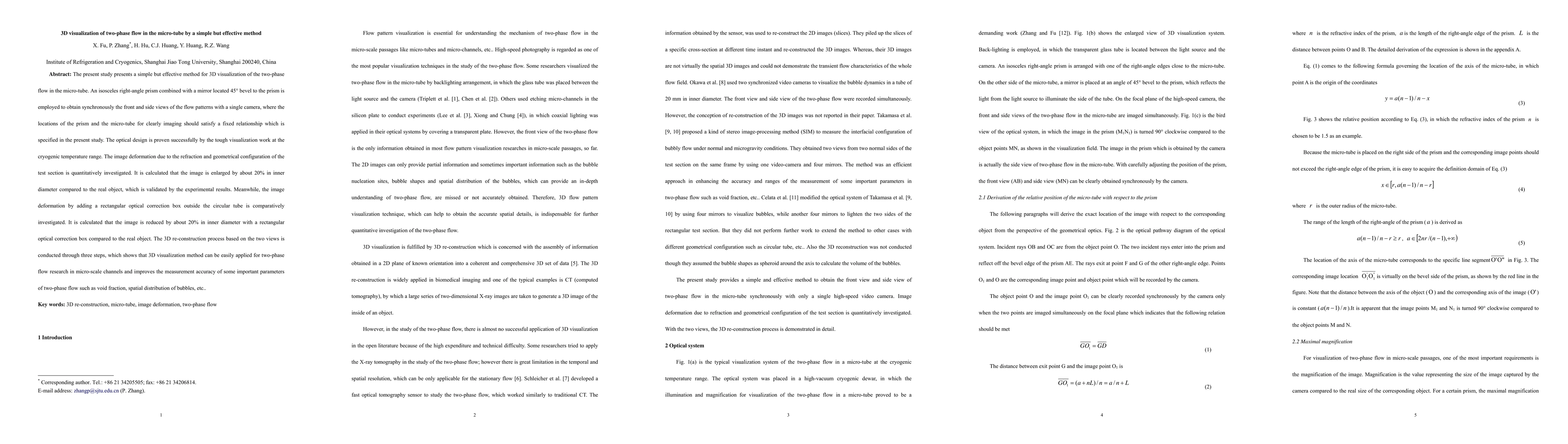 This study introduces a straightforward yet effective method for 3D visualization of two-phase flow in micro-tubes using a specially designed optical prism and mirror setup. The method enhances measurement accuracy for parameters like void fraction and bubble distribution, validated through cryogenic temperature experiments.